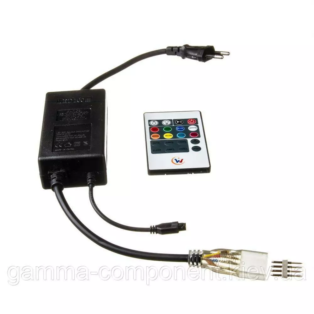 Сетевой адаптер для подключения RGB ленты 220 вольт представляет собой устройство преобразовывающее переменное напряжение в постоянное, которое управляет переключением цветов при помощи встроенного контроллера. Устройство состоит из трех частей: коннектор, адаптер со встроенным контроллером и вилка. Коннектор подключается к ленте при помощи группы пинов (pin) на 4 контакта. Удобство эксплуатации данной модели заключается в наличии дистанционного пульта управления, который идет в комплекте к адаптеру.
