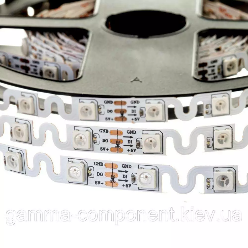 Адресна світлодіодна стрічка ws2812b (Smart-стрічка, піксельна, програмована, біжить вогонь) – представляє із себе гнучку, фігурну струмопровідну плату, на якій розташовані світлодіоди SMD5050 з вбудованими мікросхемами WS2812.