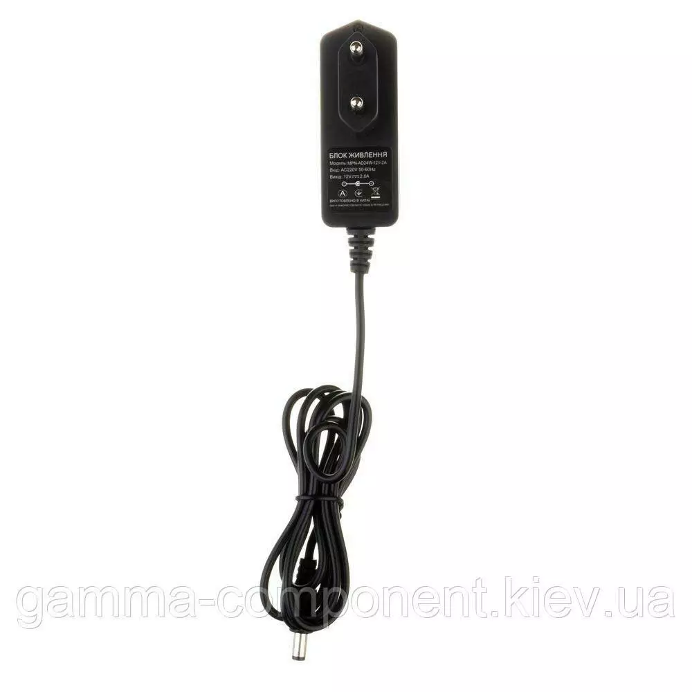 Блок живлення даного типу працює від змінного напруги – 220В, стабілізовану напругу на виході (output) 12В, максимальний вихідний струм – 2А. Вихідна максимальна потужність складає 24Вт. Тип роз'єму штекера mini jack 5.5x2.5 мм. Ступінь вологозахисту блоку живлення становить IP20, що допускає встановлення в сухих закритих приміщеннях зі зниженим рівнем вологи.
