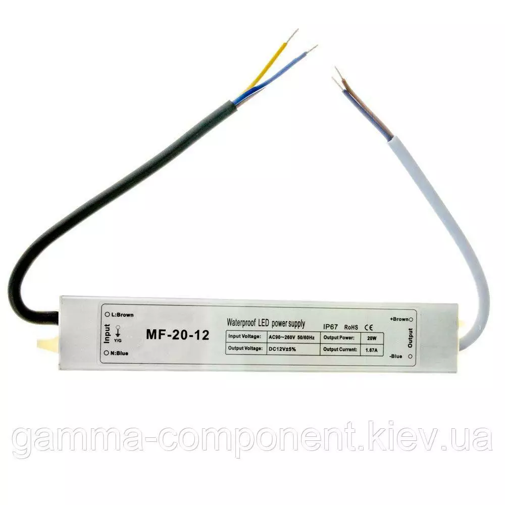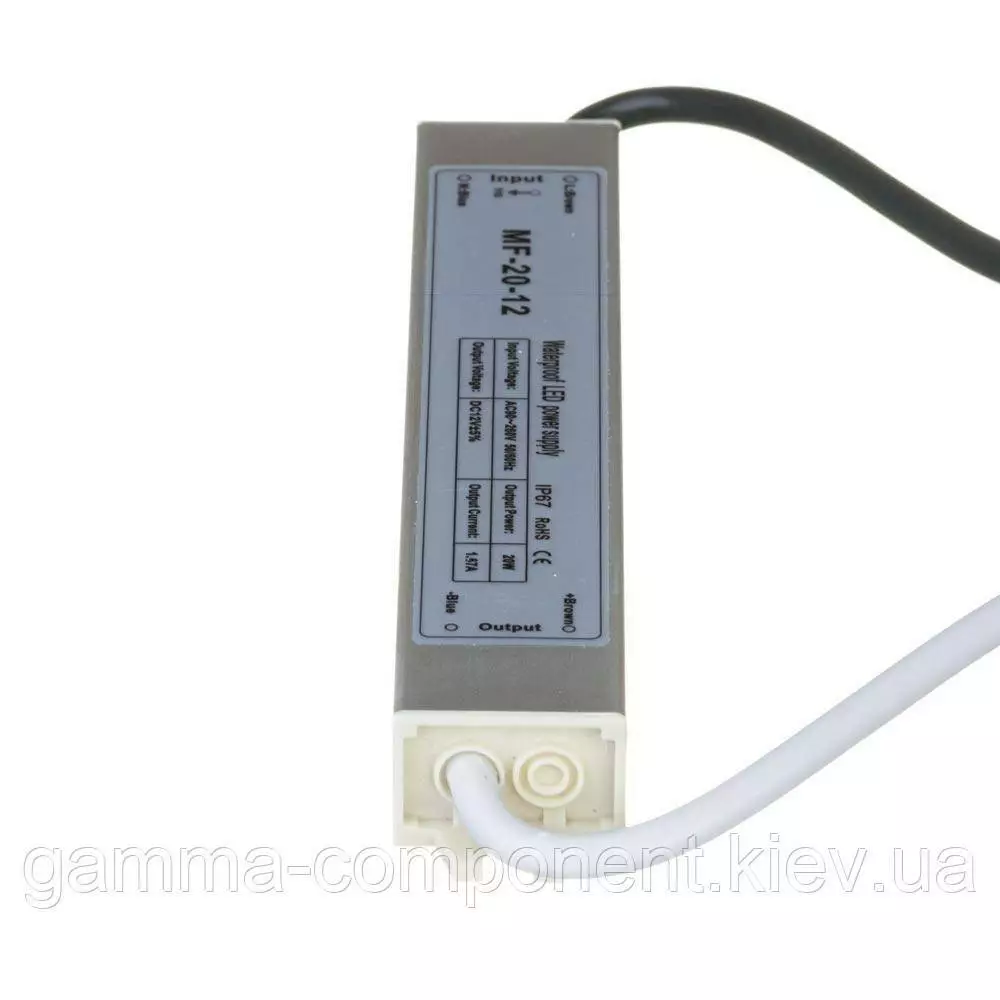 Блок живлення даного типу працює від змінного напруги – 220В, стабілізовану напругу на виході (output) 12В, максимальний вихідний струм – 1,67 А. Вихідна максимальна потужність – 20Вт. Ступінь вологозахисту IP65 (електронні компоненти всередині блоку залиті компаундом), що надає можливість встановлювати пристрій у приміщеннях з підвищеною вологістю: у ванній кімнаті, на кухні, на балконі; у вуличних умовах: в лайтбоксах, сітілайтах і зовнішніх вивісках.