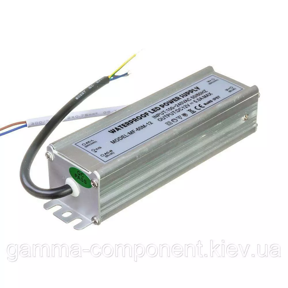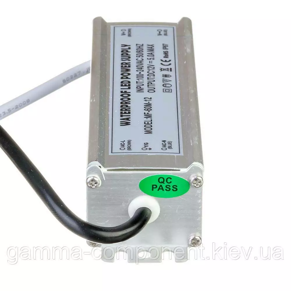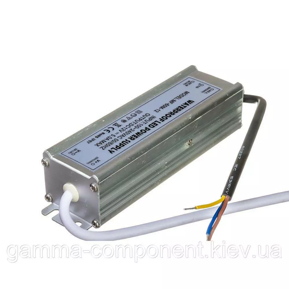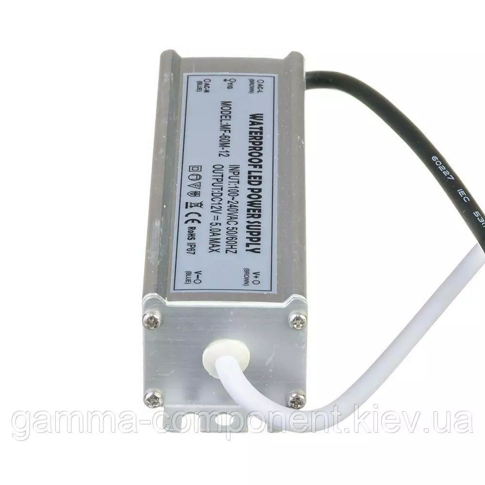 Блок живлення даного типу працює від змінного напруги – 220В, стабілізовану напругу на виході (output) 12В, максимальний вихідний струм – 5А. Вихідна максимальна потужність – 60Вт. Ступінь вологозахисту IP65 (електронні компоненти всередині блоку залиті компаундом), що надає можливість встановлювати пристрій у приміщеннях з підвищеною вологістю: у ванній кімнаті, на кухні, на балконі; у вуличних умовах: в лайтбоксах, сітілайтах і зовнішніх вивісках.