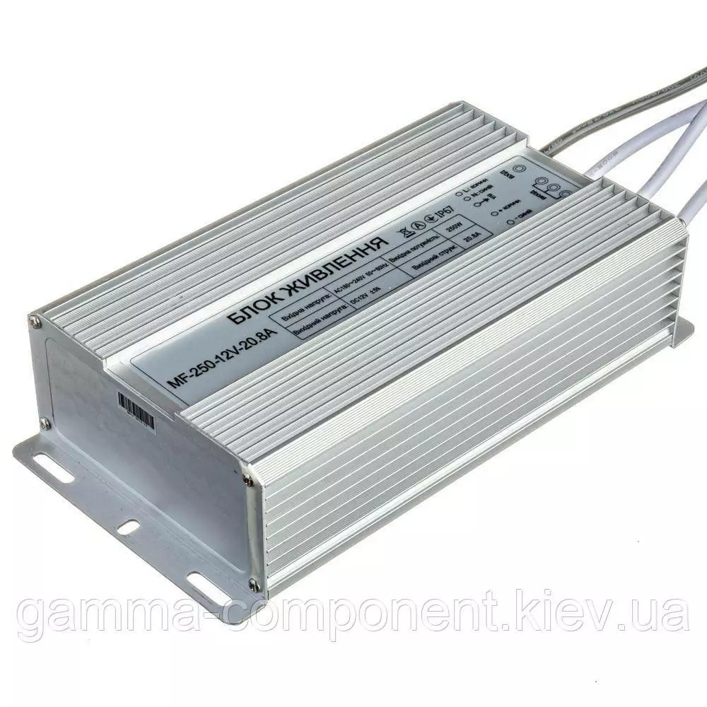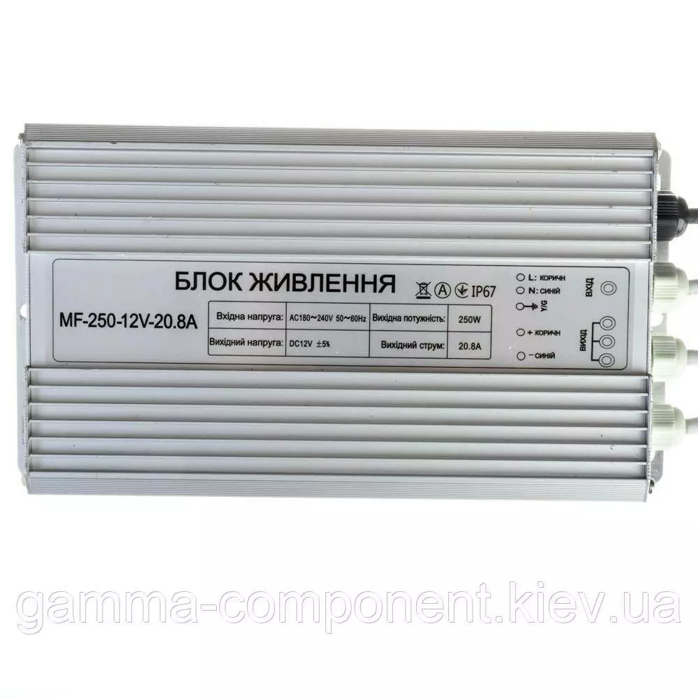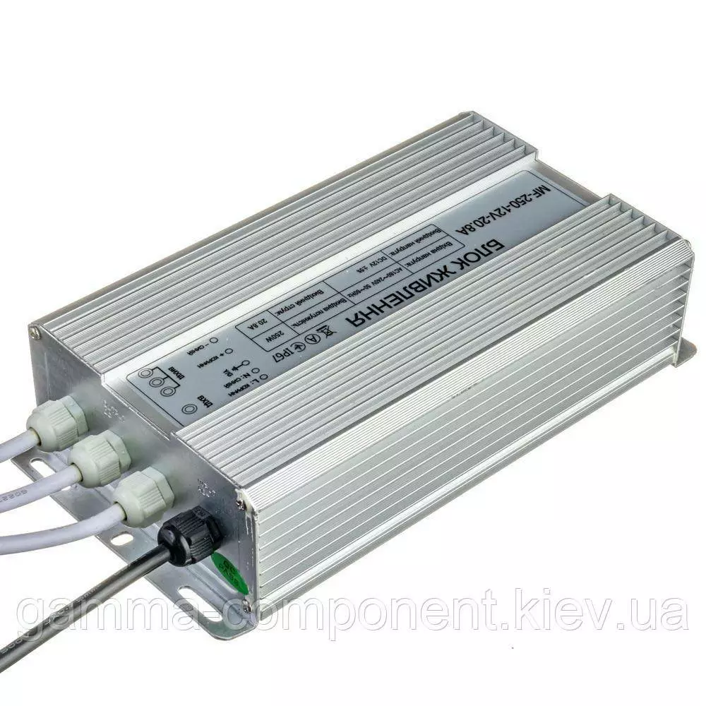 Блок живлення даного типу працює від змінного напруги – 220В, стабілізовану напругу на виході (output) 12В, максимальний вихідний струм – 20,83 А. Вихідна максимальна потужність – 250Вт. Габаритні розміри корпусу - 200x120x53 мм. Ступінь вологозахисту IP65 (електронні компоненти всередині блоку залиті компаундом), що надає можливість встановлювати пристрій у приміщеннях з підвищеною вологістю: у ванній кімнаті, на кухні, на балконі; у вуличних умовах: в лайтбоксах, сітілайтах і зовнішніх вивісках.