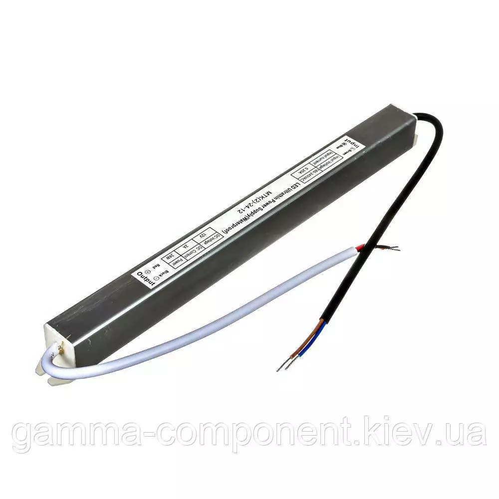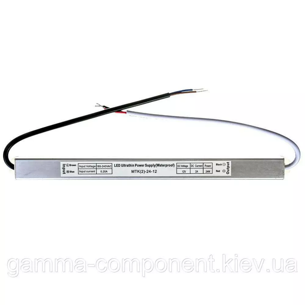 Блок живлення даного типу працює від змінного напруги – 220В, стабілізовану напругу на виході (output) 12В, максимальний вихідний струм – 2А. Вихідна максимальна потужність – 24Вт, а габаритні розміри корпусу - 263x20x22 мм. Ступінь вологозахисту IP65 (електронні компоненти всередині блоку залиті компаундом), що надає можливість встановлювати пристрій у приміщеннях з підвищеною вологістю: у ванній кімнаті, на кухні, на балконі; у вуличних умовах: в лайтбоксах, сітілайтах і зовнішніх вивісках.