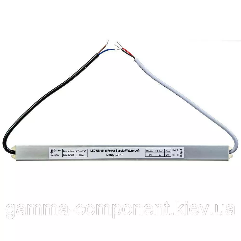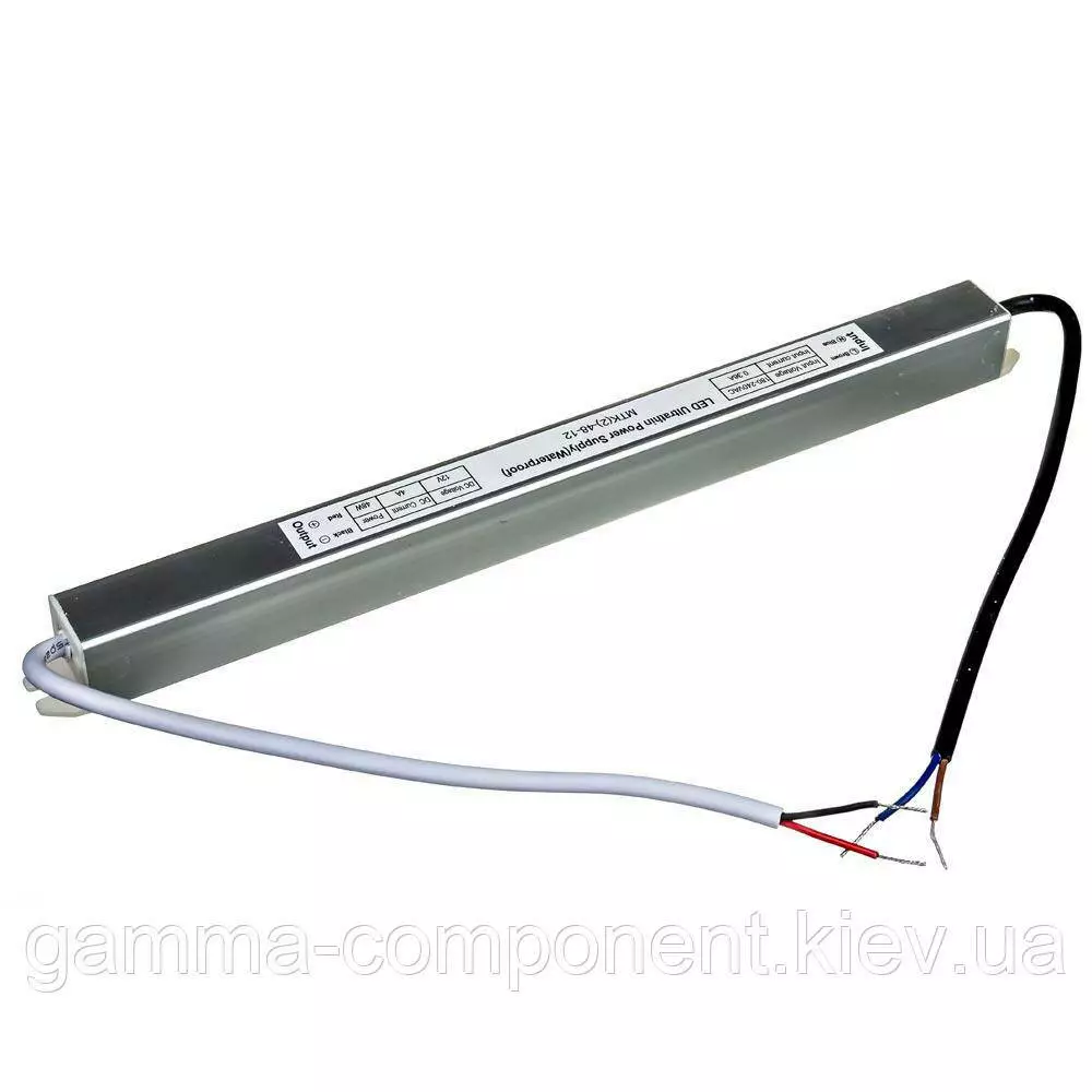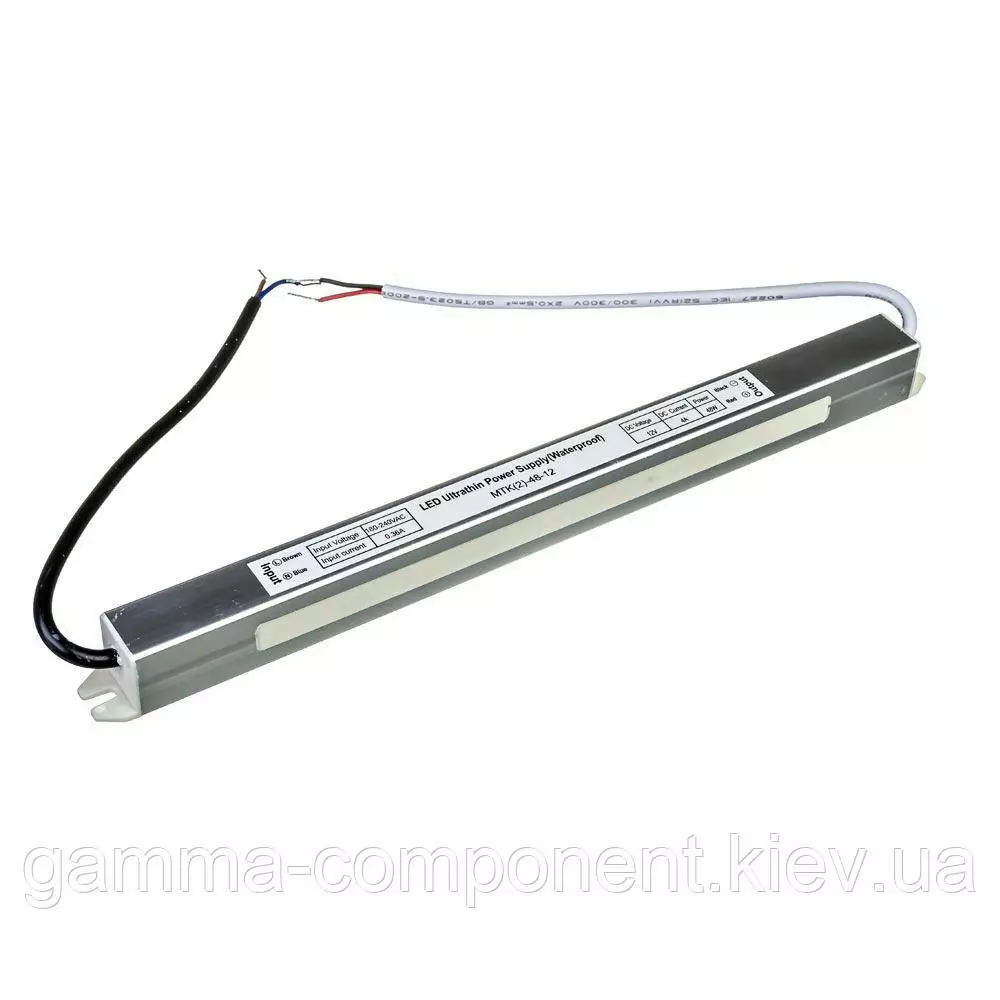 Блок живлення даного типу працює від змінного напруги – 220В, стабілізовану напругу на виході (output) 12В, максимальний вихідний струм – 4А. Вихідна максимальна потужність – 48Вт, а габаритні розміри корпусу - 285x20x22 мм. Ступінь вологозахисту IP65 (електронні компоненти всередині блоку залиті компаундом), що надає можливість встановлювати пристрій у приміщеннях з підвищеною вологістю: у ванній кімнаті, на кухні, на балконі; у вуличних умовах: в лайтбоксах, сітілайтах і зовнішніх вивісках.