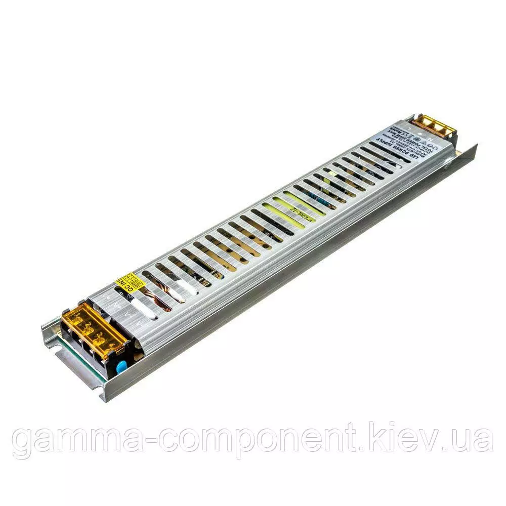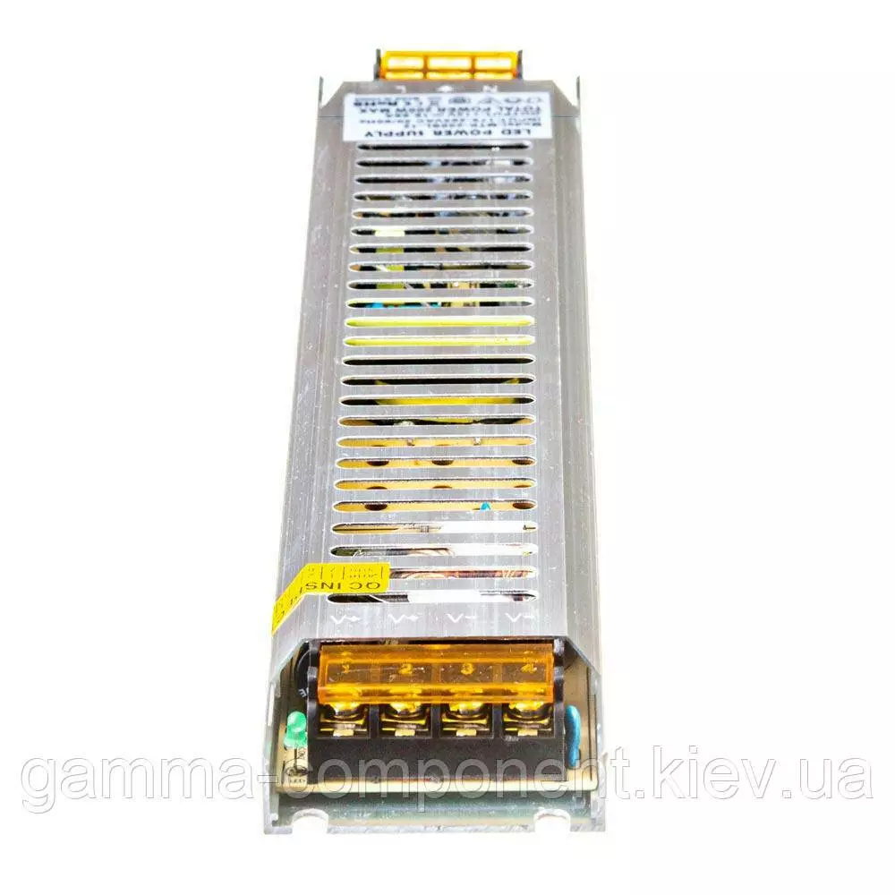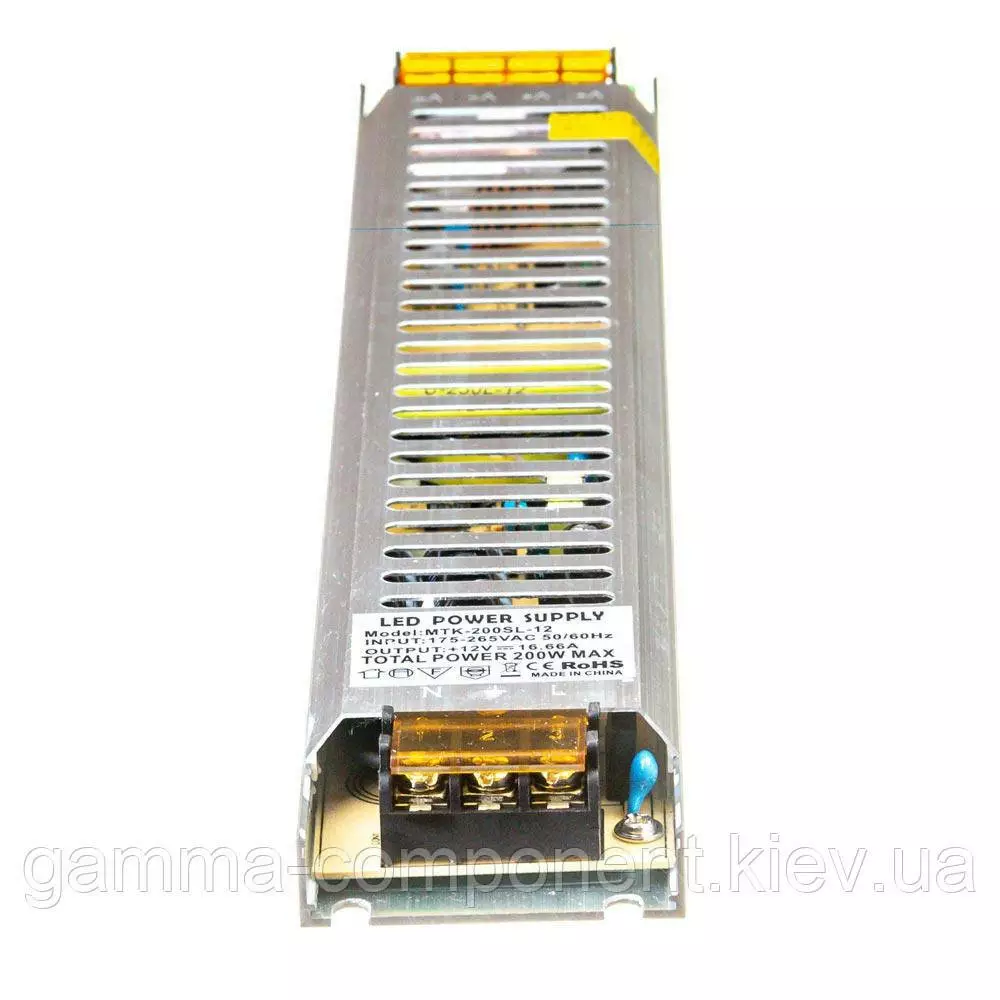 Блок живлення даного типу працює від змінного напруги – 220В, стабілізовану напругу на виході (output) 12В, максимальний вихідний струм – 16,5 А. Наявність потенціометра дозволяє точно налаштувати напруга на виході блоку живлення. Вихідна максимальна потужність – 200 вт. Компактні габарити розміри корпусу блоку живлення – 235x53x22,5 мм дозволяють встановлювати його в невеликих, вузьких просторах. Ступінь захисту від вологи IP20 – використовується в умовах зниженої вологості повітря усередині приміщень. Блок живлення 12 вольт працює безшумно, що дозволяє його застосовувати в житлових приміщеннях.