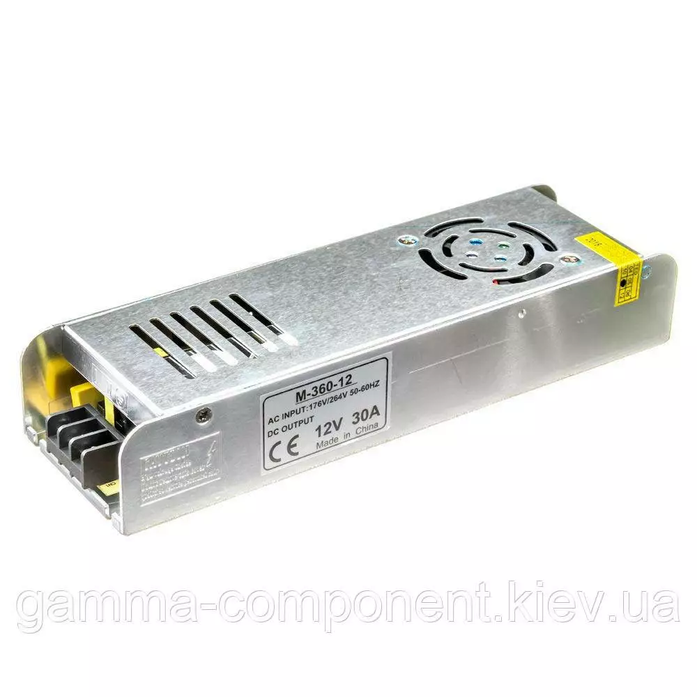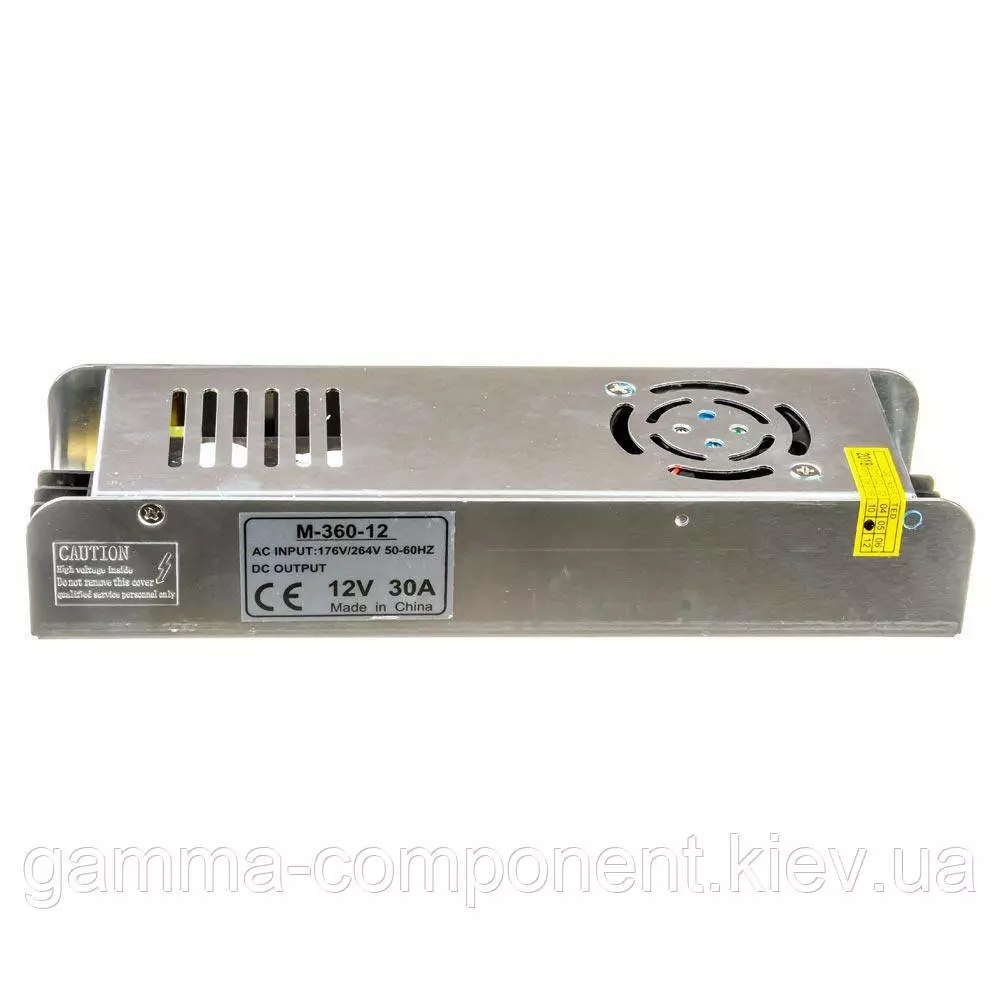 Блок живлення даного типу працює від змінного напруги – 220В, стабілізовану напругу на виході (output) 12В, максимальний вихідний струм – 30А. Вихідна максимальна потужність 360Вт. Габаритні розміри корпусу - 224*68*40 мм. Має рівень захисту IP20 - використовується всередині приміщень в умовах зниженої вологості повітря. Джерело живлення 12в оснащений кулером для охолодження внутрішніх електронних компонентів. Не рекомендується використовувати для житлових із-за шуму від куллера. Також цей прилад має вбудований захист від перевантажень і короткого замикання. Это значительно повышает срок службы блока питания и гарантирует его стабильную работу.