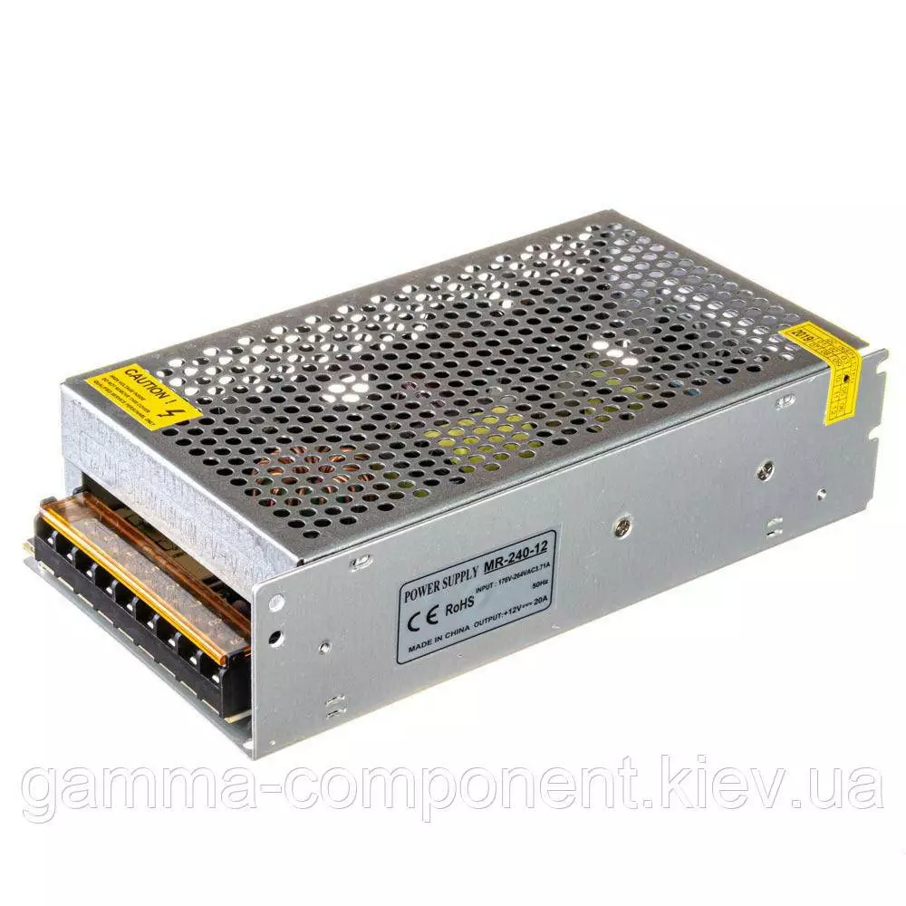 Блок живлення даного типу працює від змінного напруги – 220В, стабілізовану напругу на виході (output) 12В, максимальний вихідний струм – 20А. Габаритні розміри корпусу блоку живлення 12v - 198*98*42 мм. максимальна Вихідна потужність 240Вт. Має рівень захисту IP20 - використовується в умовах зниженої вологості повітря (всередині приміщень).
