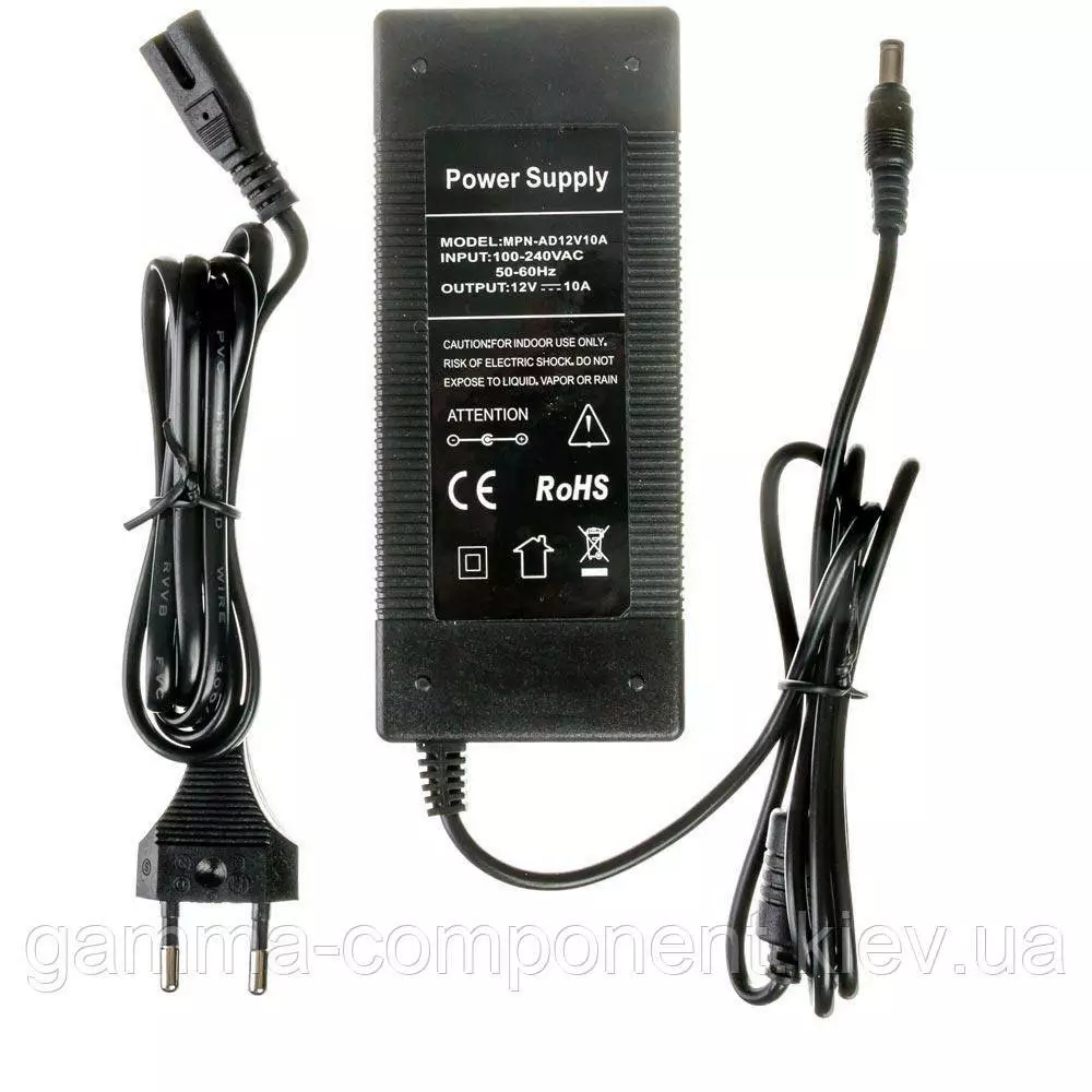 Імпульсний блок живлення на 12 вольт 10 ампер виконаний в пластиковому корпусі з пасивною системою охолодження з вилкою являє собою перетворювач змінної напруги 220 Вольт в постійне 12 Вольт.