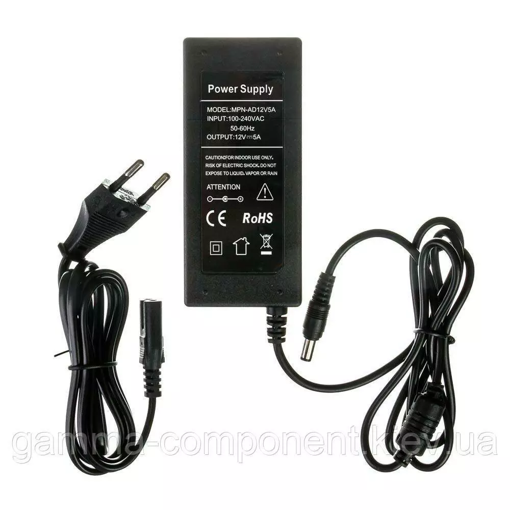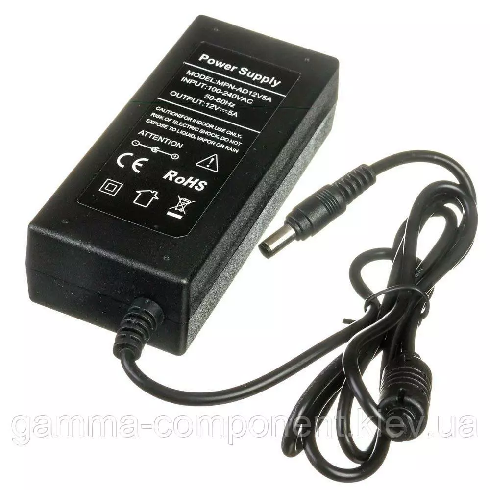 Импульсный блок питания на 12 вольт 5 ампер выполнен в пластиковом корпусе с пассивной системой охлаждения с вилкой представляет собой преобразователь переменного напряжения 220 Вольт в постоянное 12 Вольт.