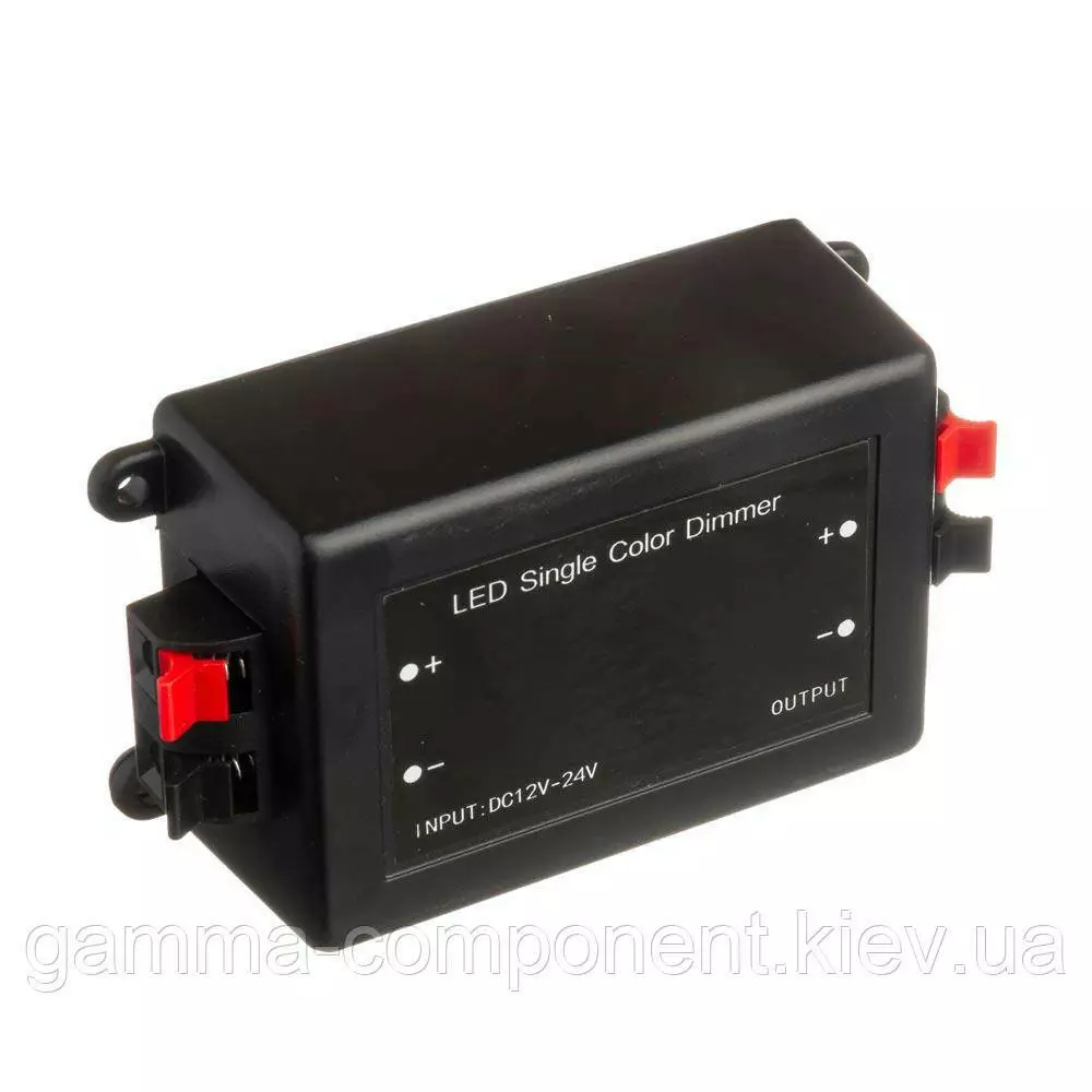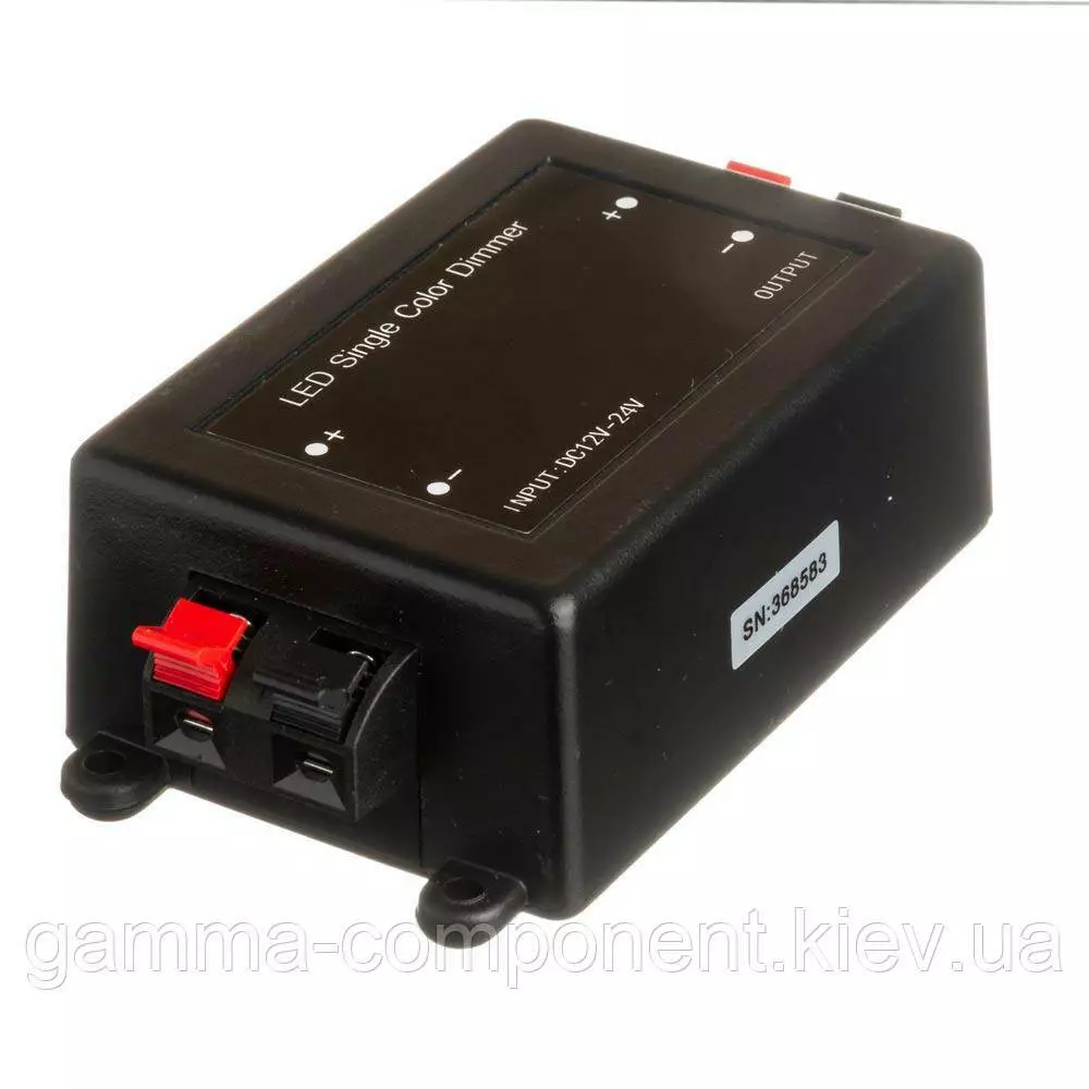 Напруга живлення диммера - 12В, кількість каналів – один, максимальний струм 8А. Пристрій має 7 рівнів яскравості в діапазоні від 10% до 100%, а також 4 динамічних режиму з можливістю регулювання швидкості мерехтіння світлодіодних стрічок. Якщо Вам необхідно збільшити навантаження для даного диммера, то Вам потрібно підсилювач.