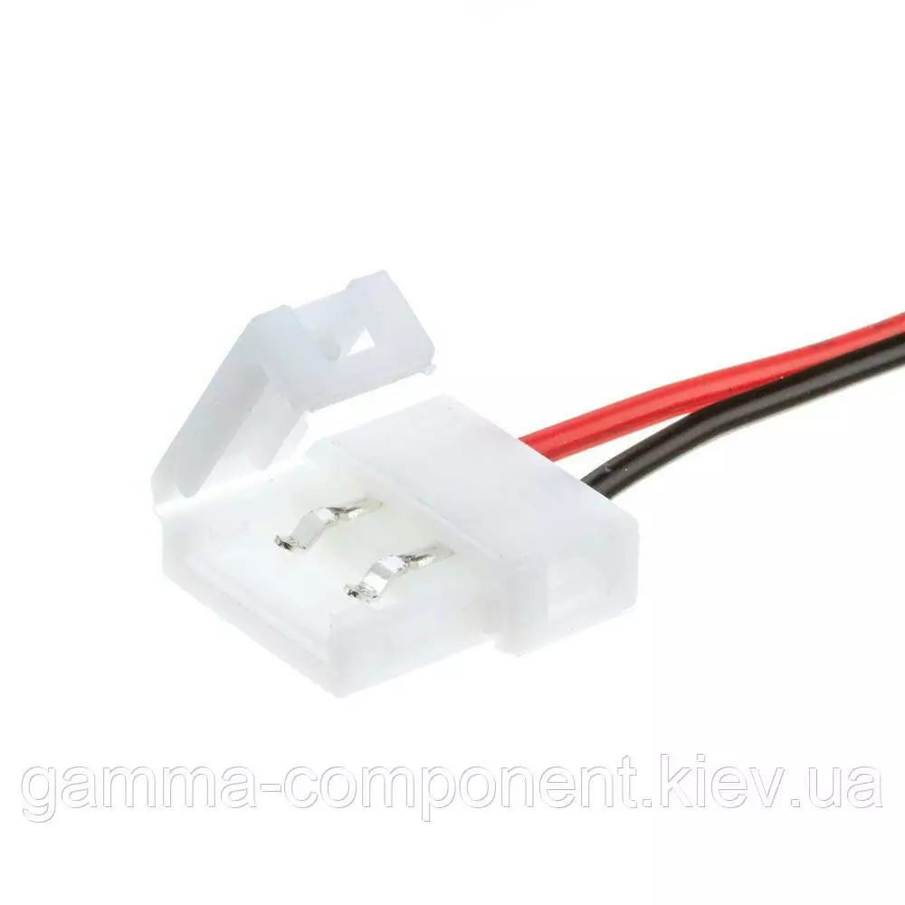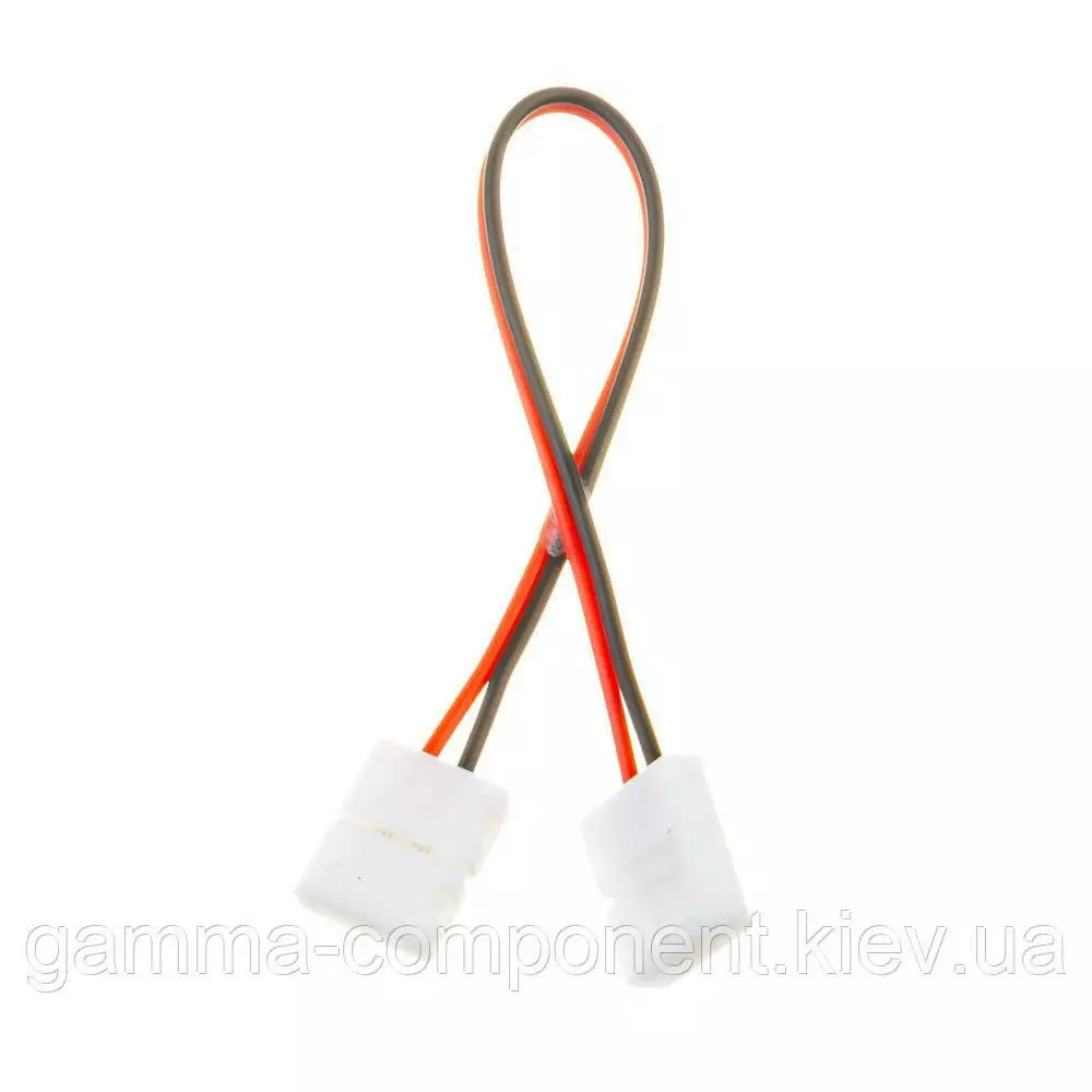 Конектор 8 мм в пластиковому корпусі, з 2 роз'ємами (в кожному по 2 контакту) і з проводом. Призначений для роботи при напрузі 12В і для підключення одноколірних (монохромних) лід стрічок зі світлодіодами 3528/2835 шириною плати 8 міліметрів.