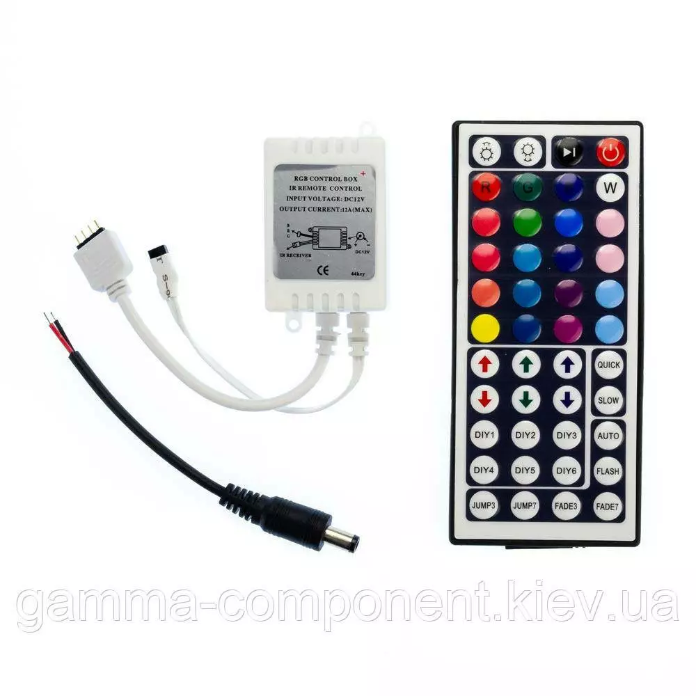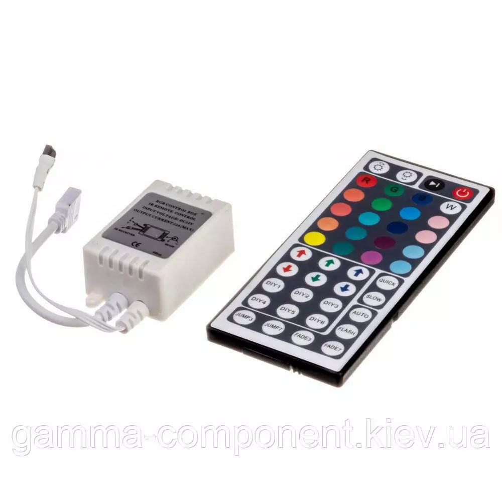 Для включения и выключения ленты, настройки различных режимов, регулировки яркости и управления цветами, используется инфракрасный пульт rgb. Данный пульт на 44 кнопки. Дальность сигнала до 20 метров.