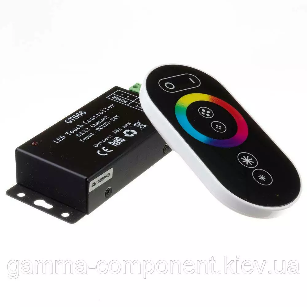 Для включення і виключення стрічки, налаштування різних режимів, регулювання яскравості і управління кольорами, використовується чорний сенсорний радіо пульт rgb. Даний пульт на 6 кнопок. Дальність сигналу до 20 метрів.