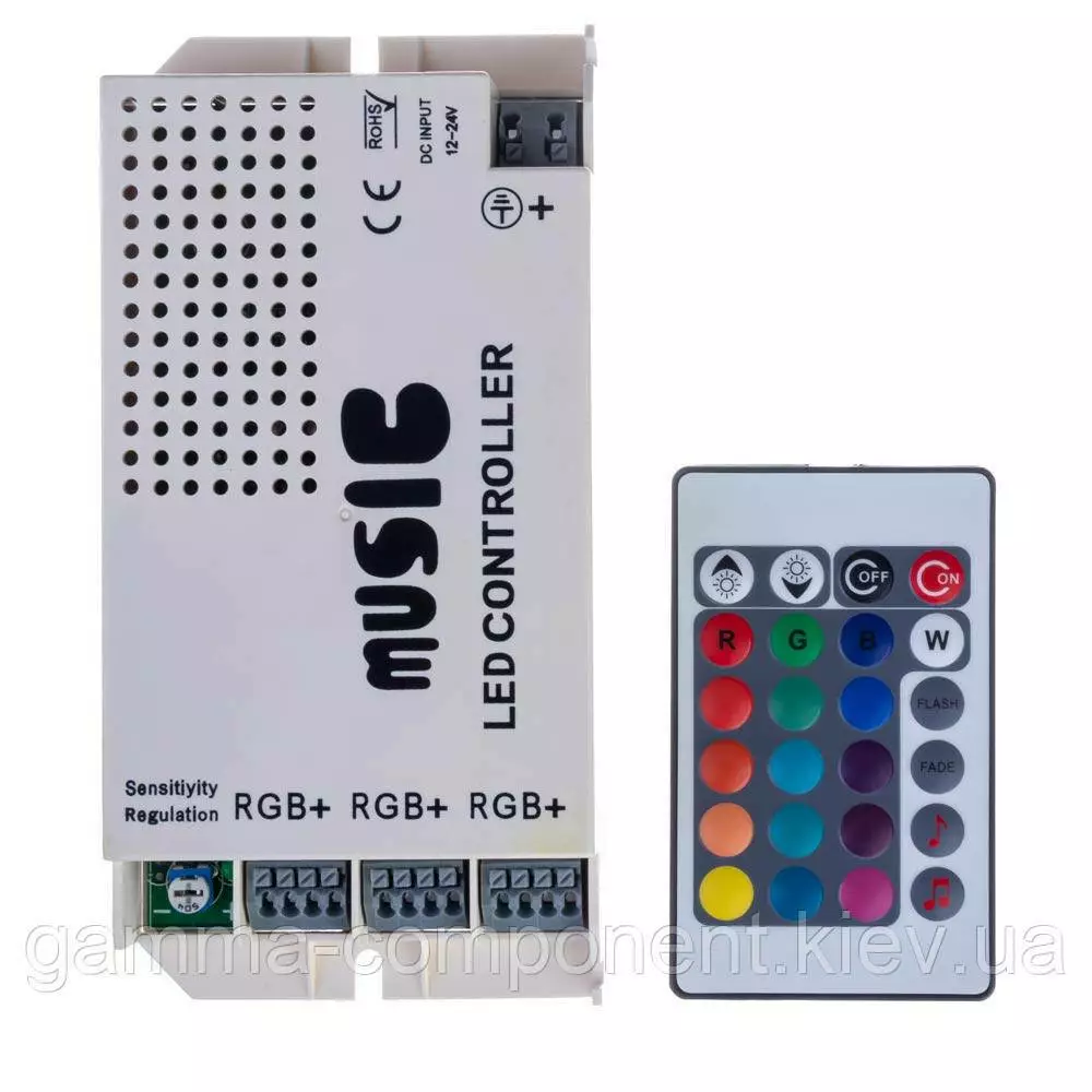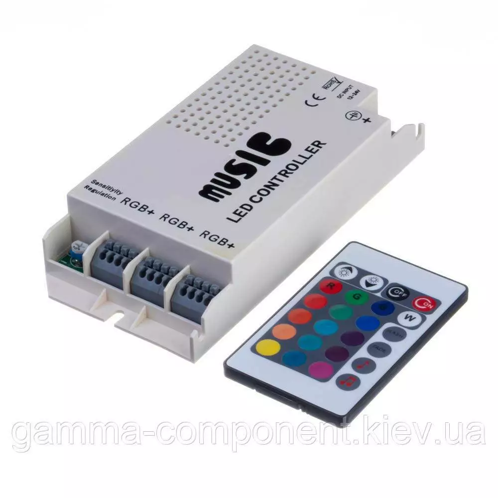 Музичний Rgb контролер – це електронний пристрій для дистанційного керування і створення світлодинамічних ефектів світлодіодні RGB стрічок і модулів 12В. З його допомогою Ви можете створювати до 16 мільйонів унікальних кольорів і відтінків, управління дозволяє вибирати один з 15 режимів статичного кольору. Має фіксований вибір білого кольору світіння, управління яскравістю світіння в статичних режимах і регулювання швидкістю роботи в динамічних режимах. Контролер для світлодіодної стрічки є незамінним помічником при створенні своїми руками яскравою і неповторною світлодіодного підсвічування будь-яких інтер'єрів.
