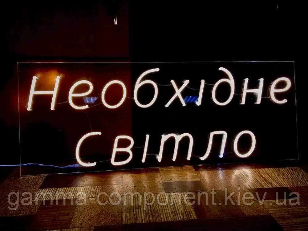 Неонова вивіска виготовлена з гнучкого світлодіодного неону 12 В. Матеріал основи — прозорий акрил. До комплектації входить блок живлення для під'єднання до мережі живлення 220 В.