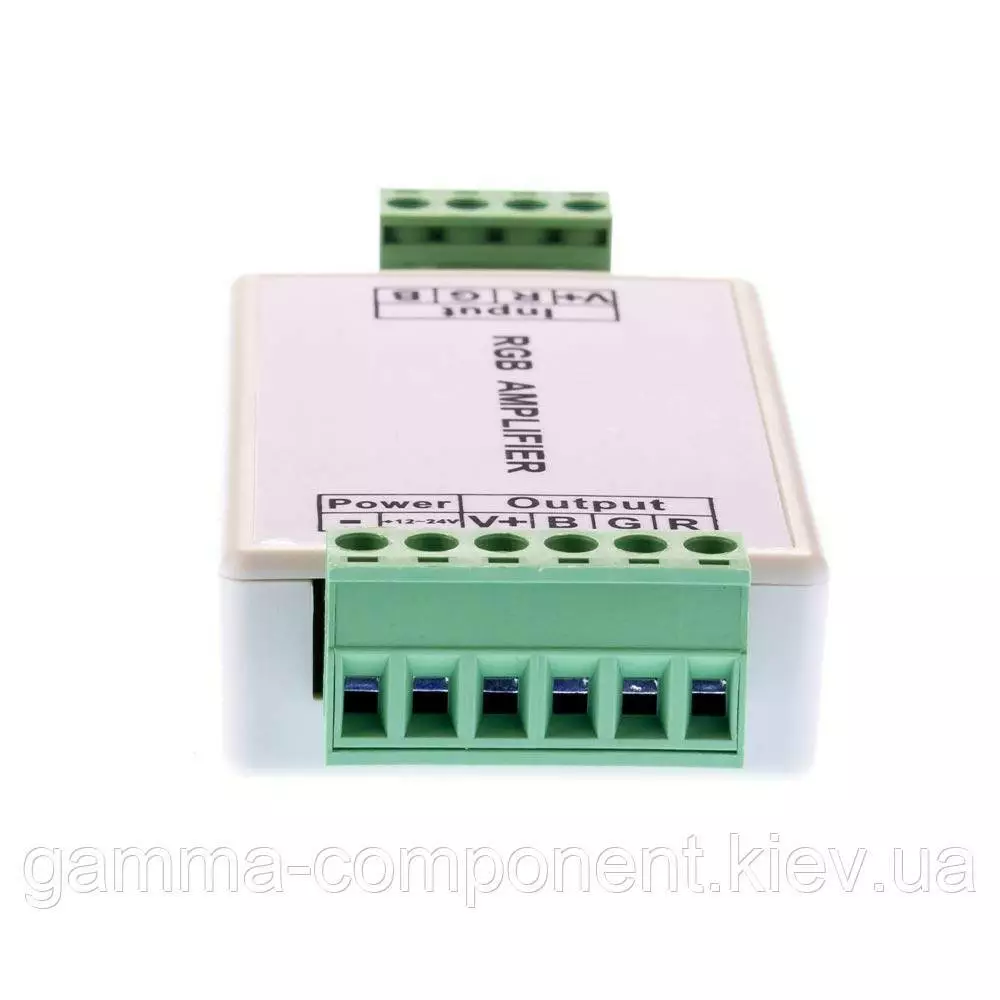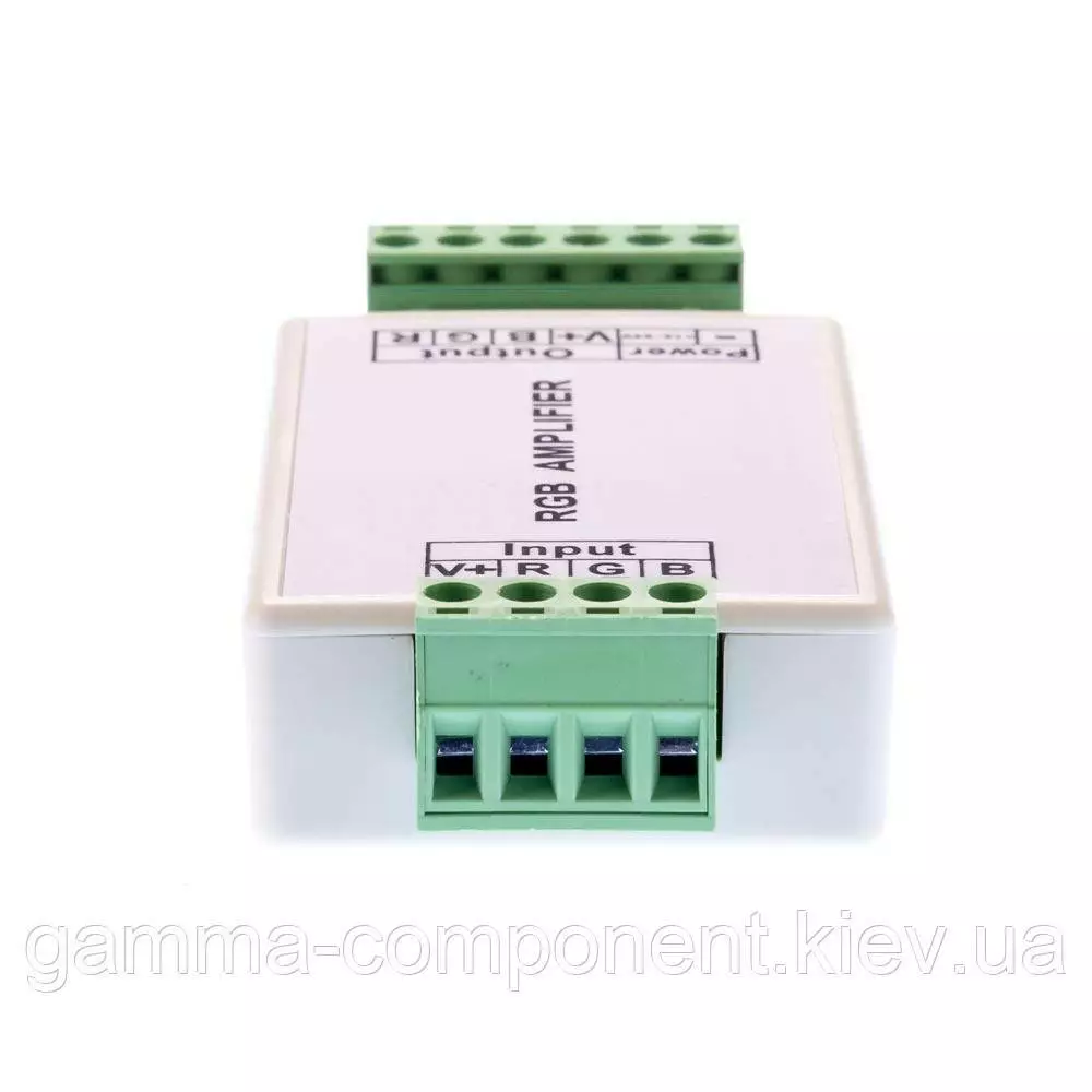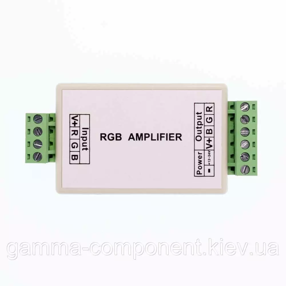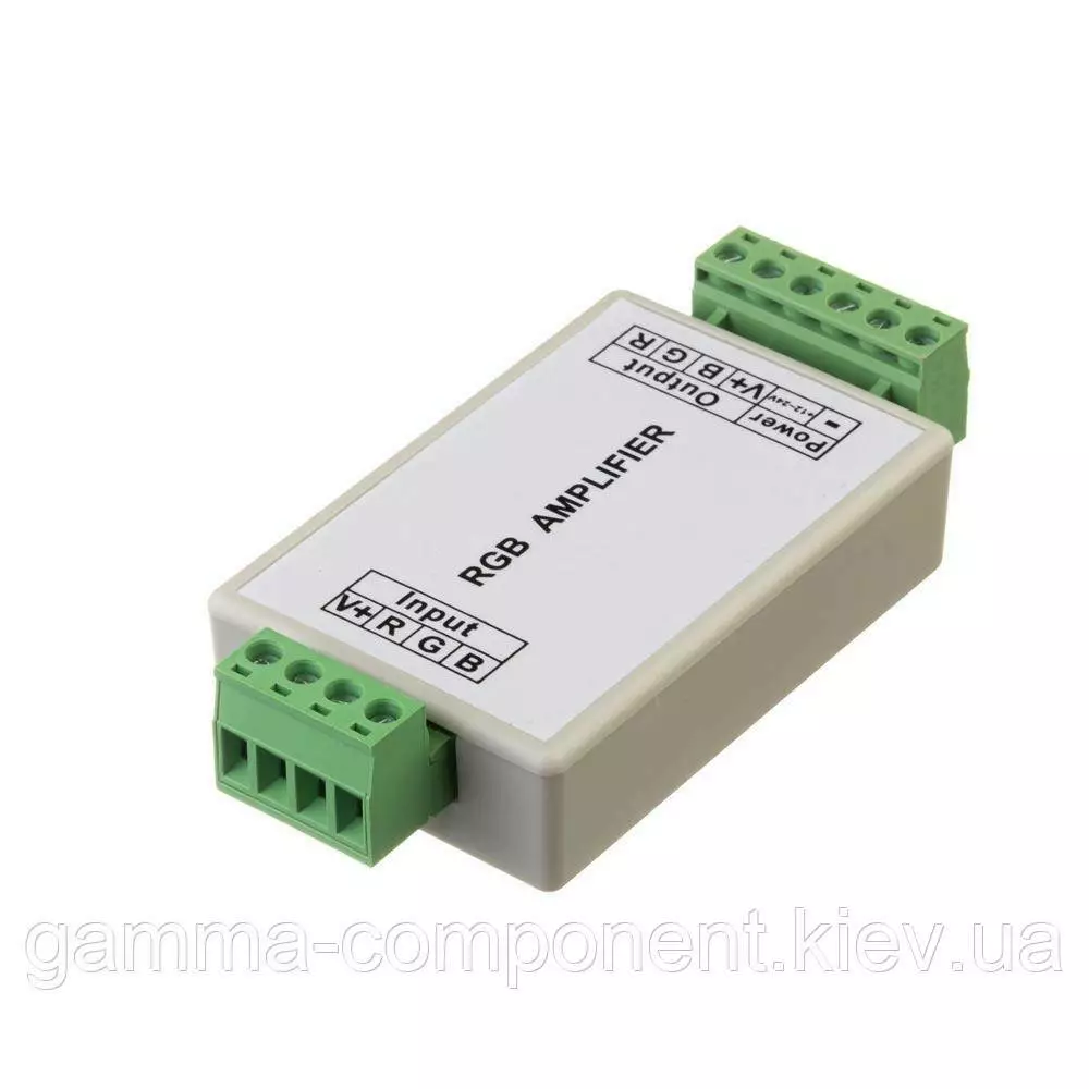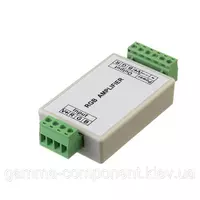 Rgb підсилювач має вхідну напругу 12 вольт, максимальний струм 12А. Максимальна потужність підсилювача до 144Вт. Має пластиковий корпус світло-сірого кольору.