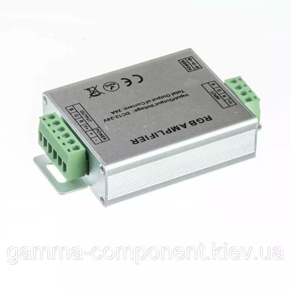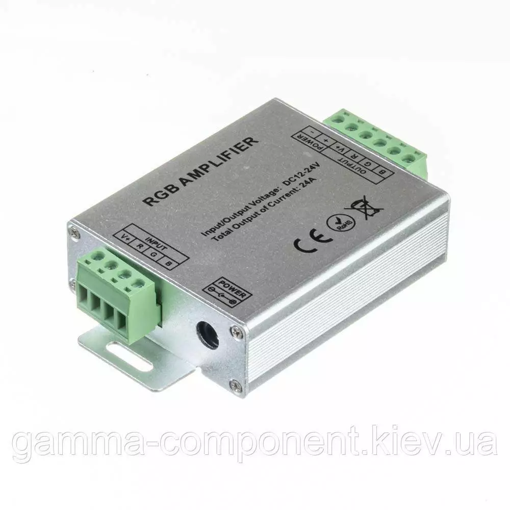 Потужність підсилювача для rgb стрічки до 288Вт. Rgb підсилювач має вхідну напругу 12 вольт, максимальний струм 24А. Корпус алюмінієвий срібного кольору.