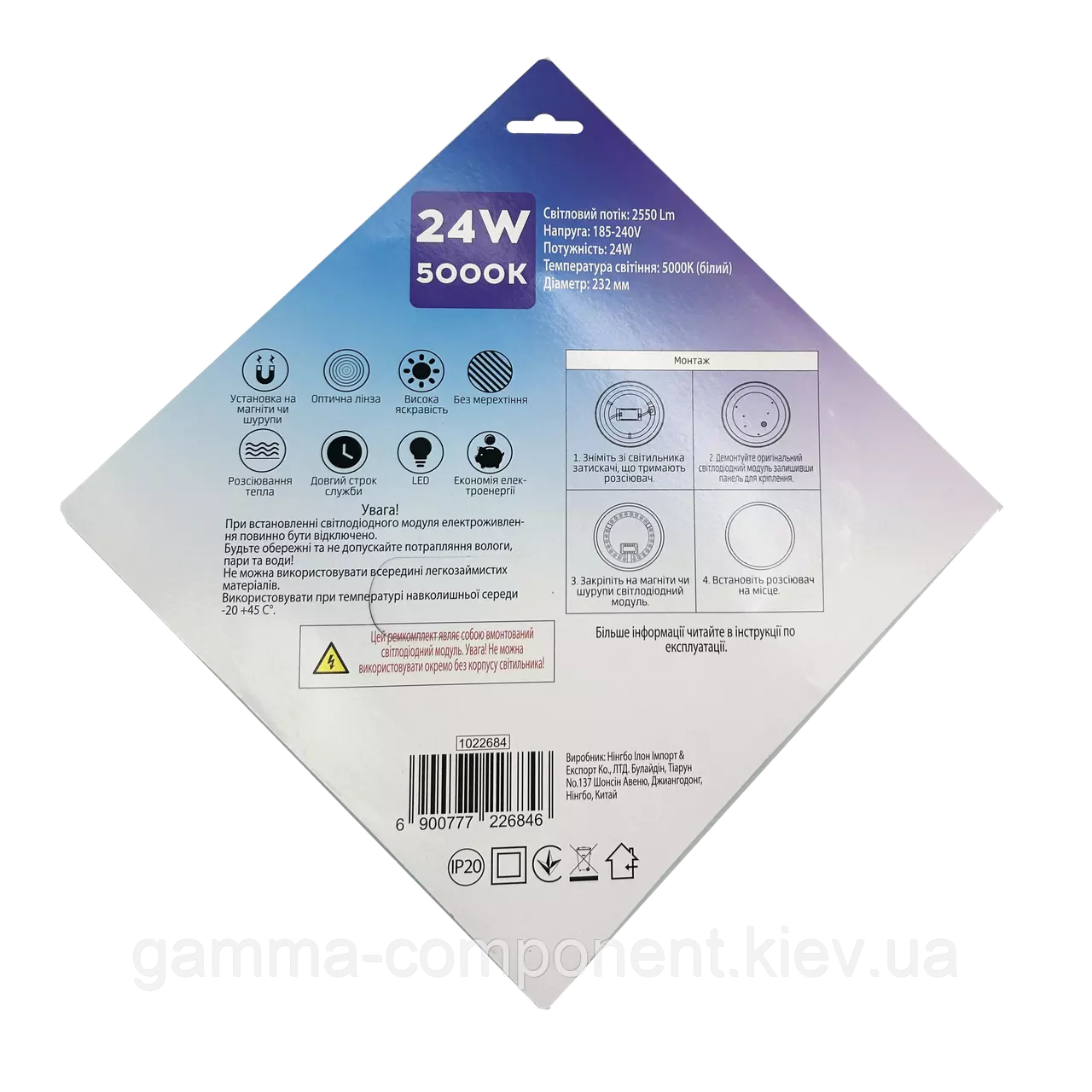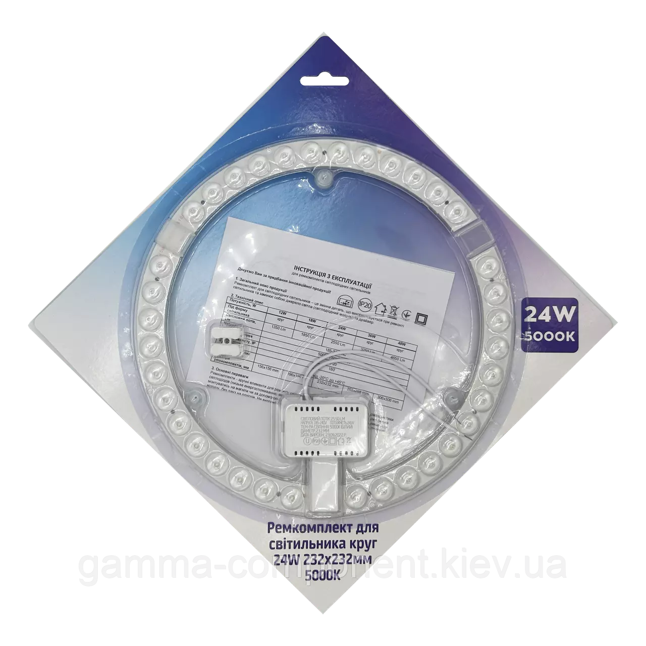 Світлодіодний модуль для ремонту круглого світильника 24 Вт з розмірами 232х232 мм - ідеальний варіант для оновлення вашого освітлення. Забезпечуючи приємний нейтральний білий колір (5000К) світла. Робочий діапазон напруги від 185 до 240 В, що робить його практично універсальним для різних умов використання.