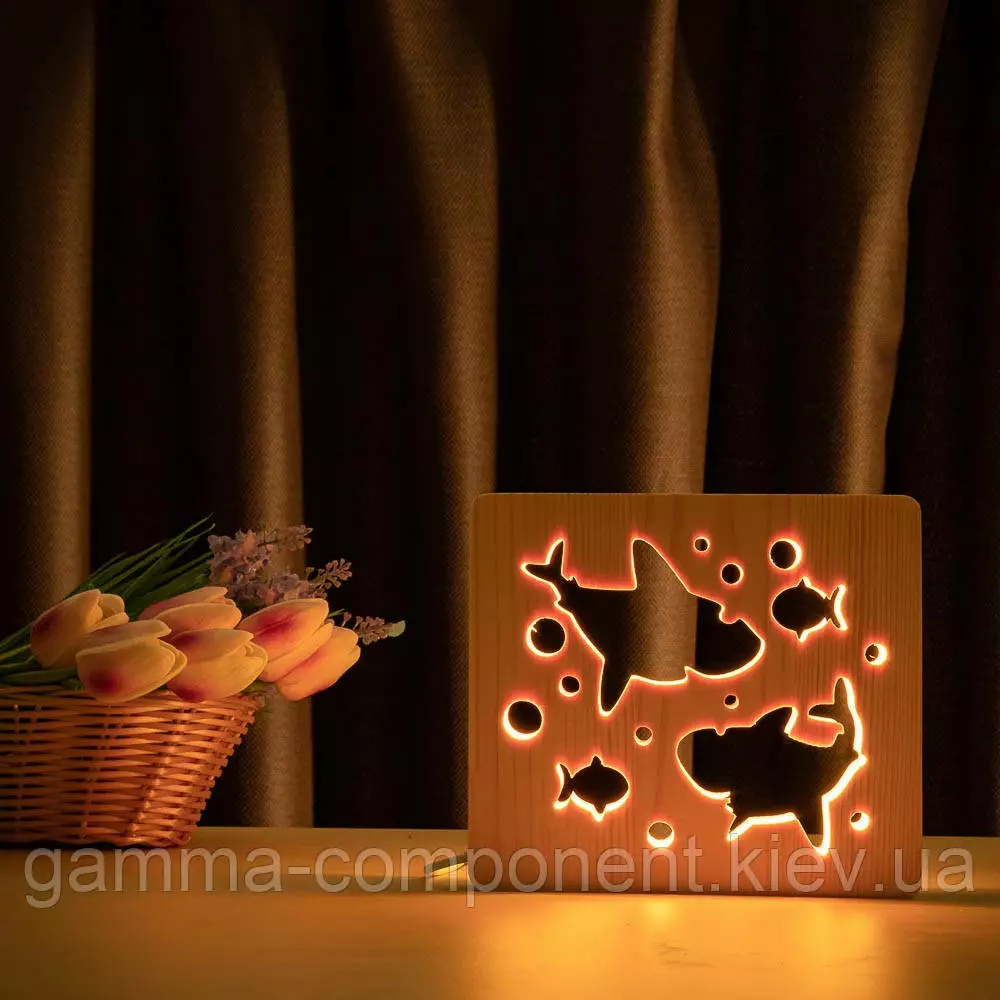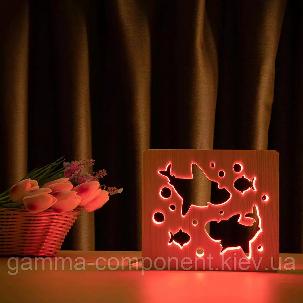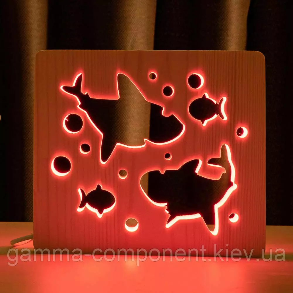 Світильник нічник з дерева LED "Дві акули і рибки" з пультом і регулюванням кольори, RGB