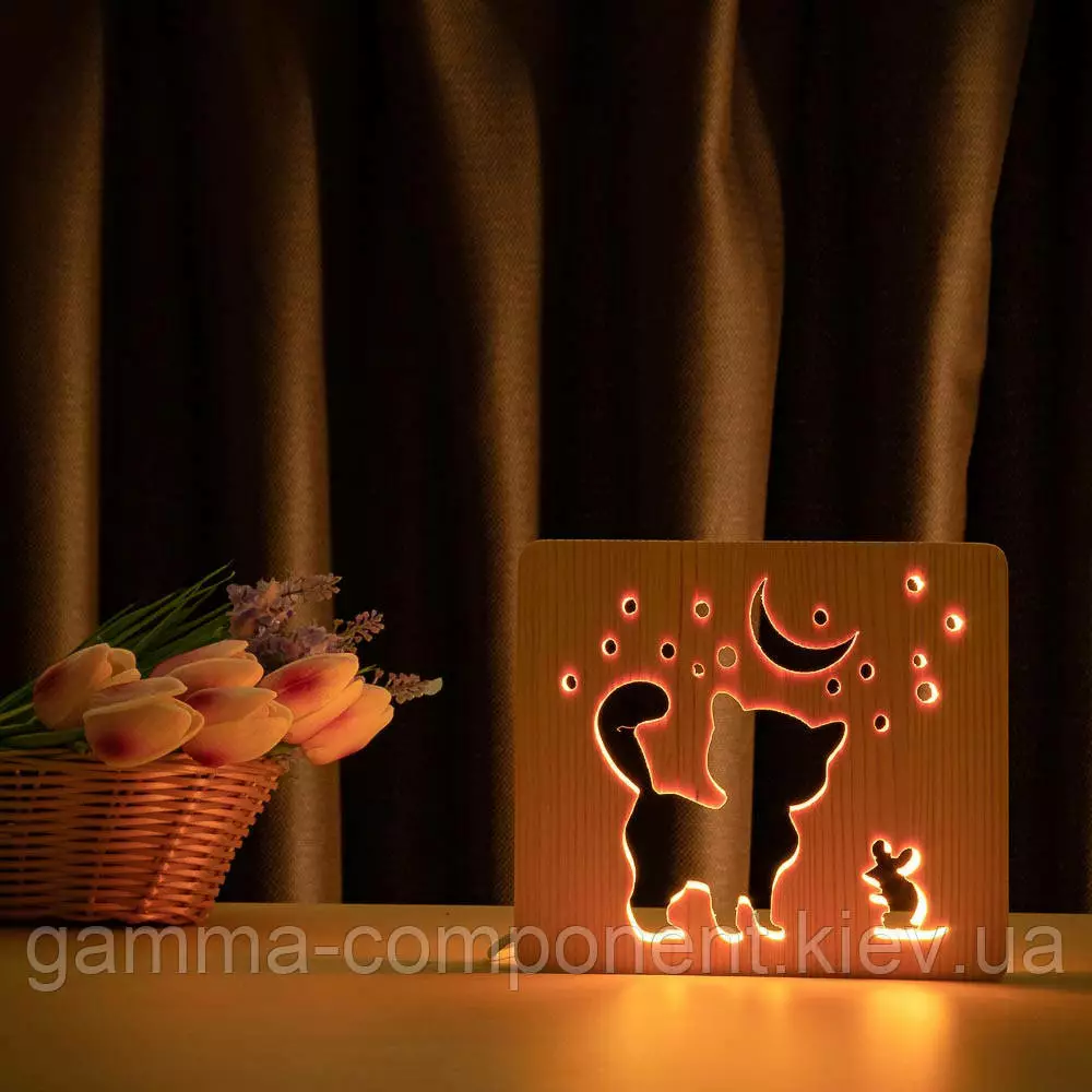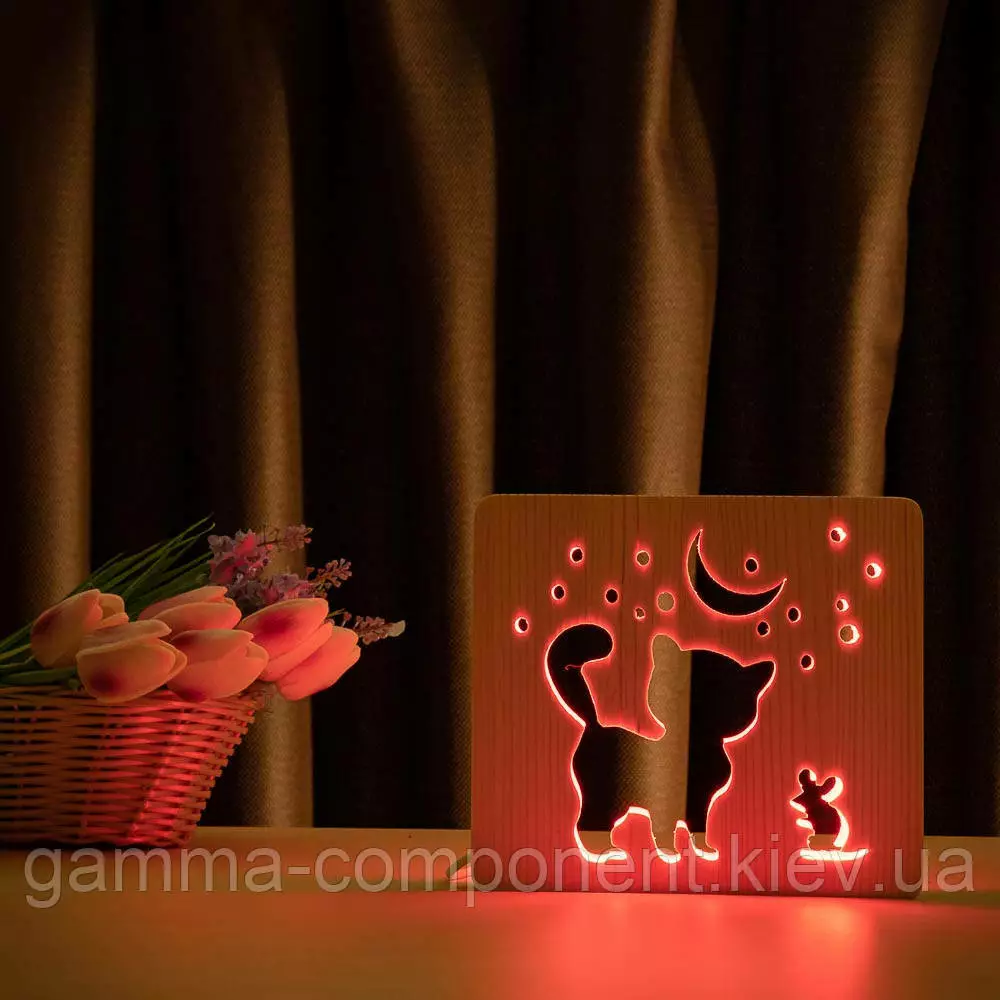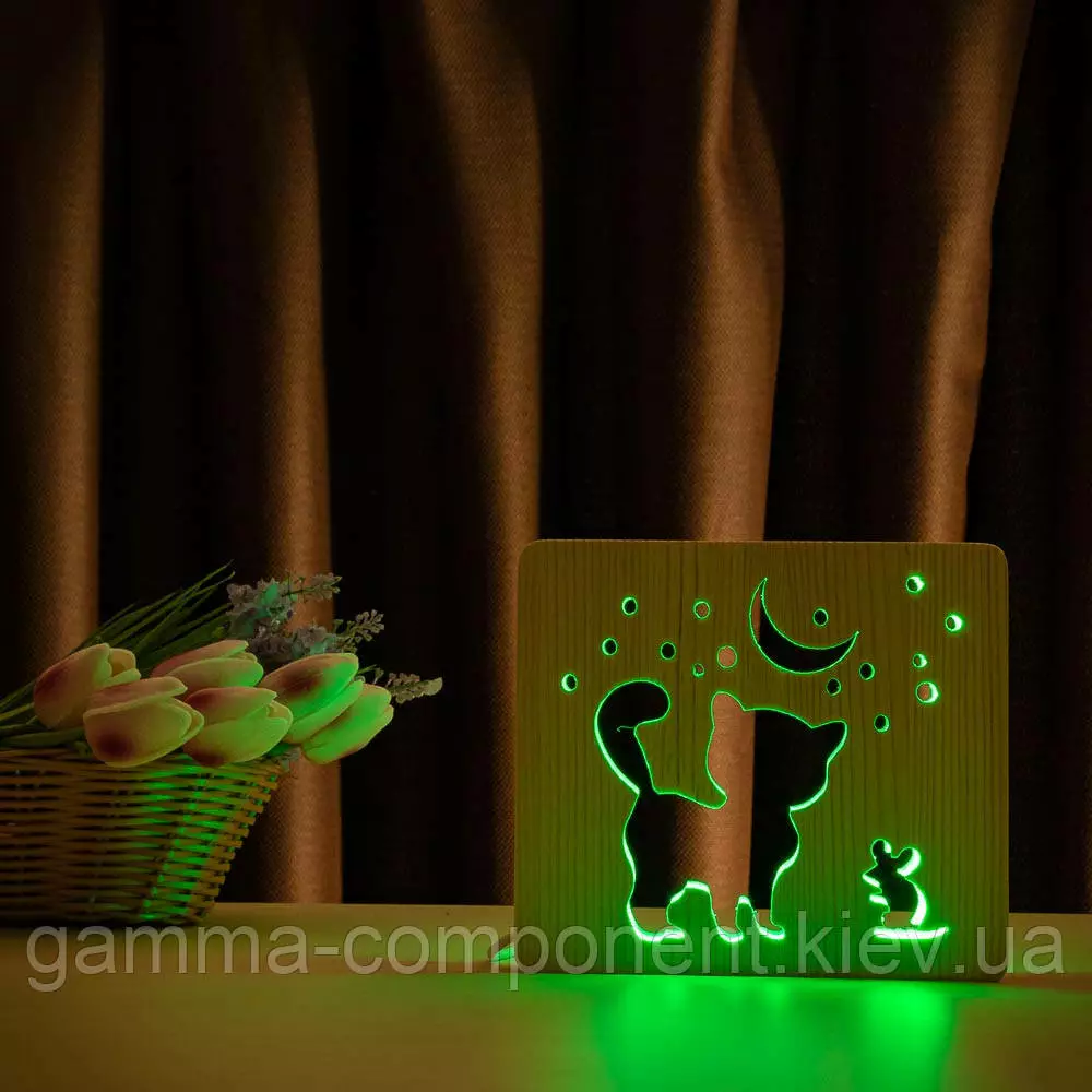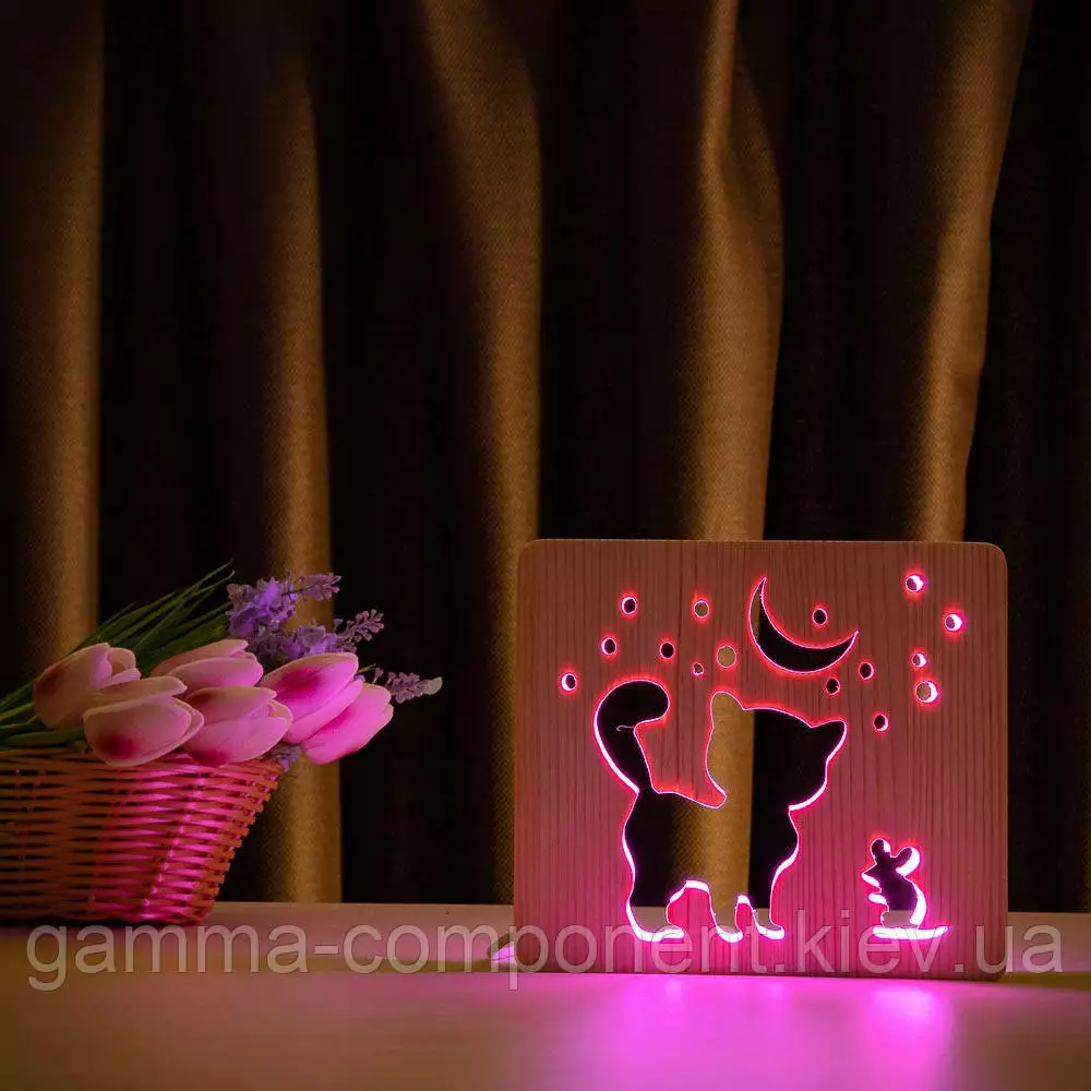Світильник нічник з дерева LED "Кіт і мишка під місяцем" з пультом і регулюванням кольори, RGB