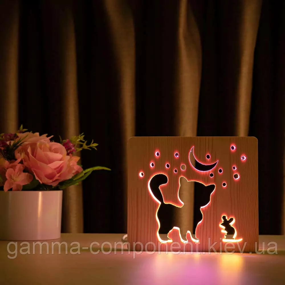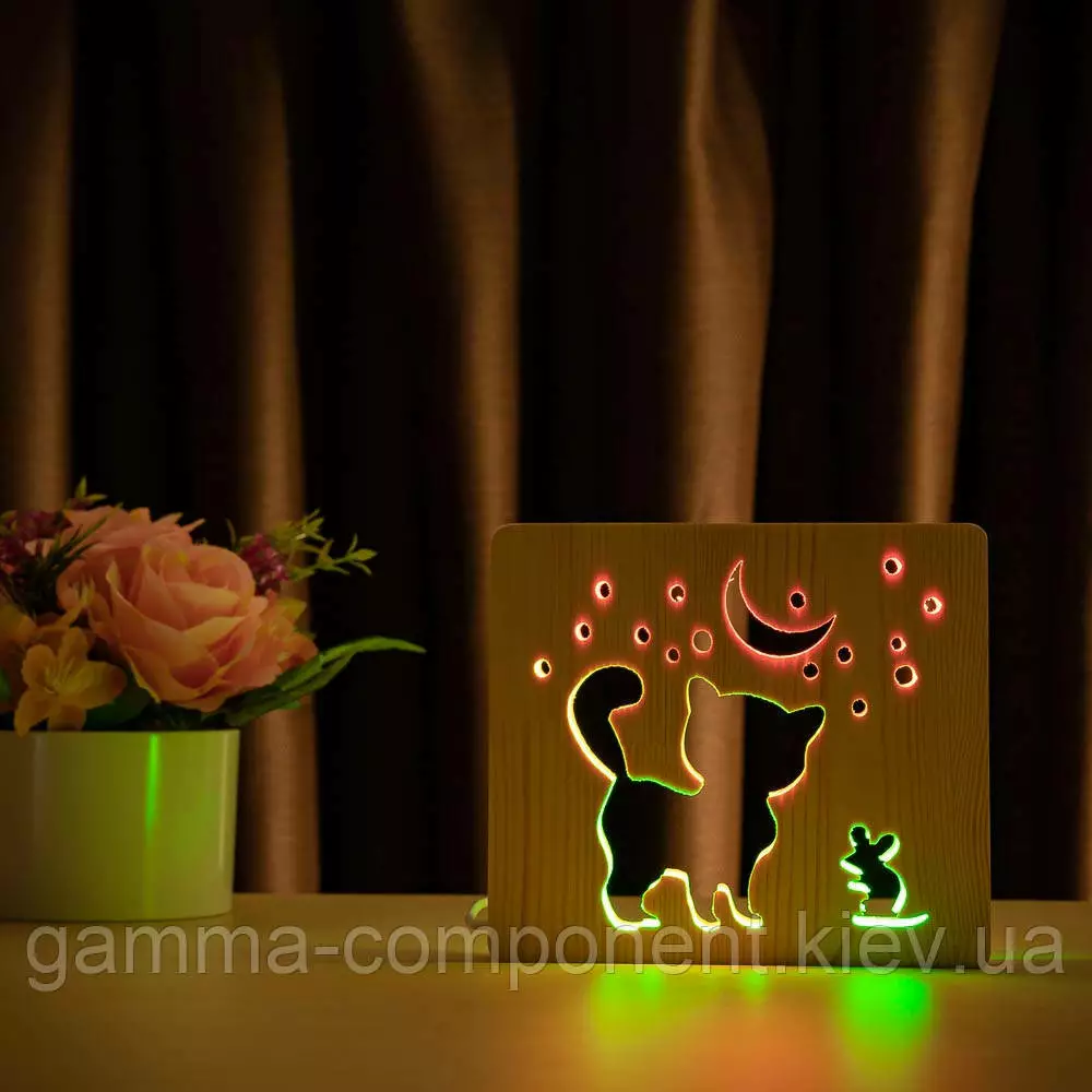 Світильник нічник з дерева LED "Кіт і мишка під місяцем" з пультом і регулюванням кольору, подвійний RGB