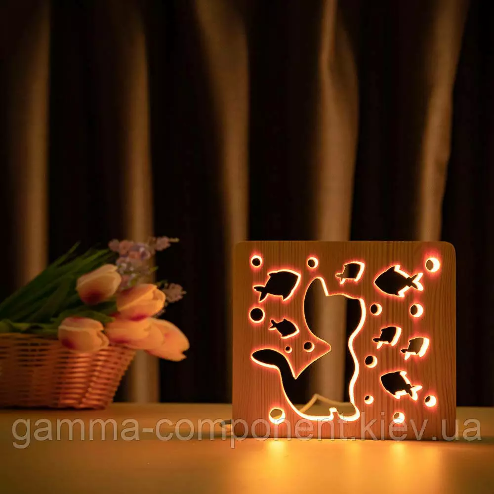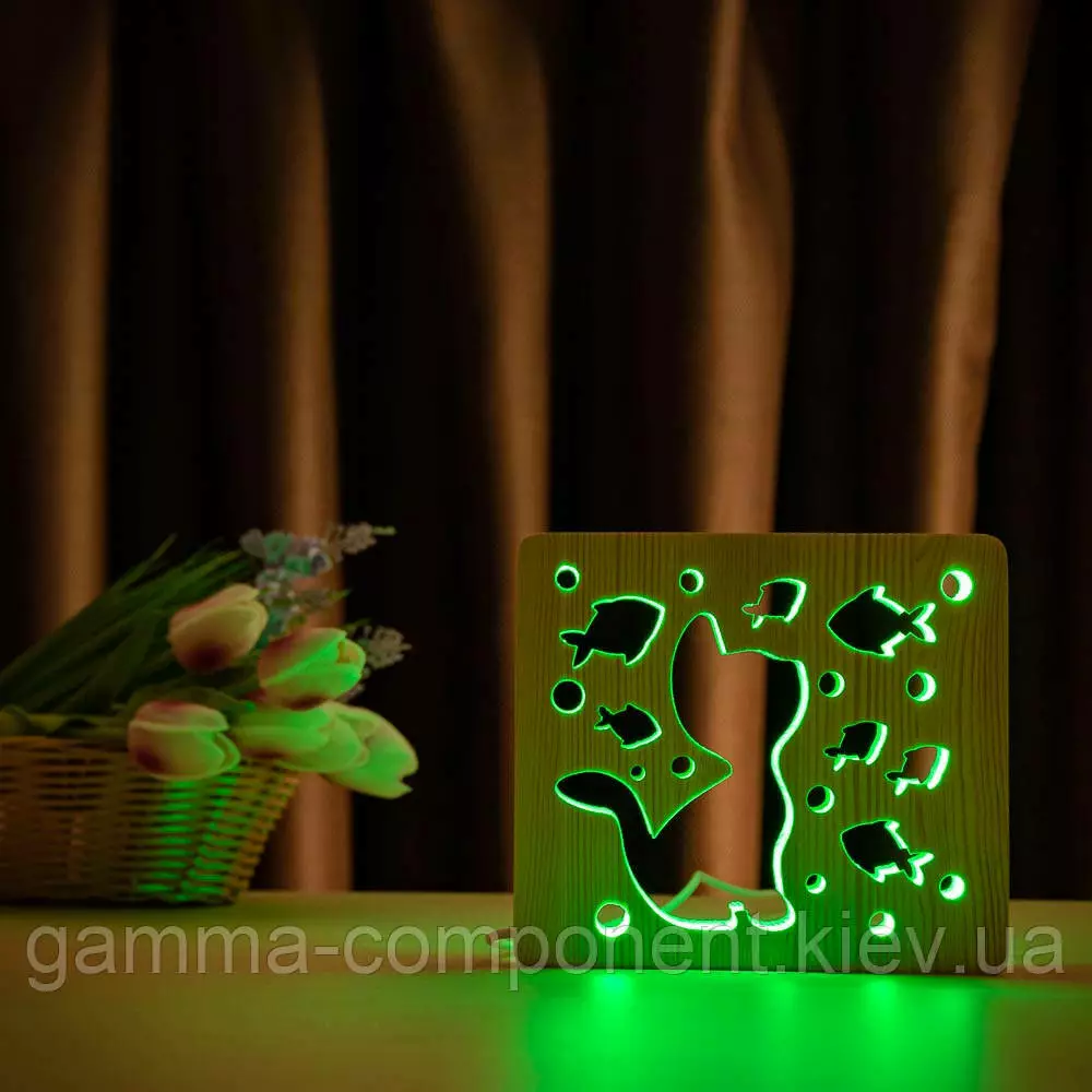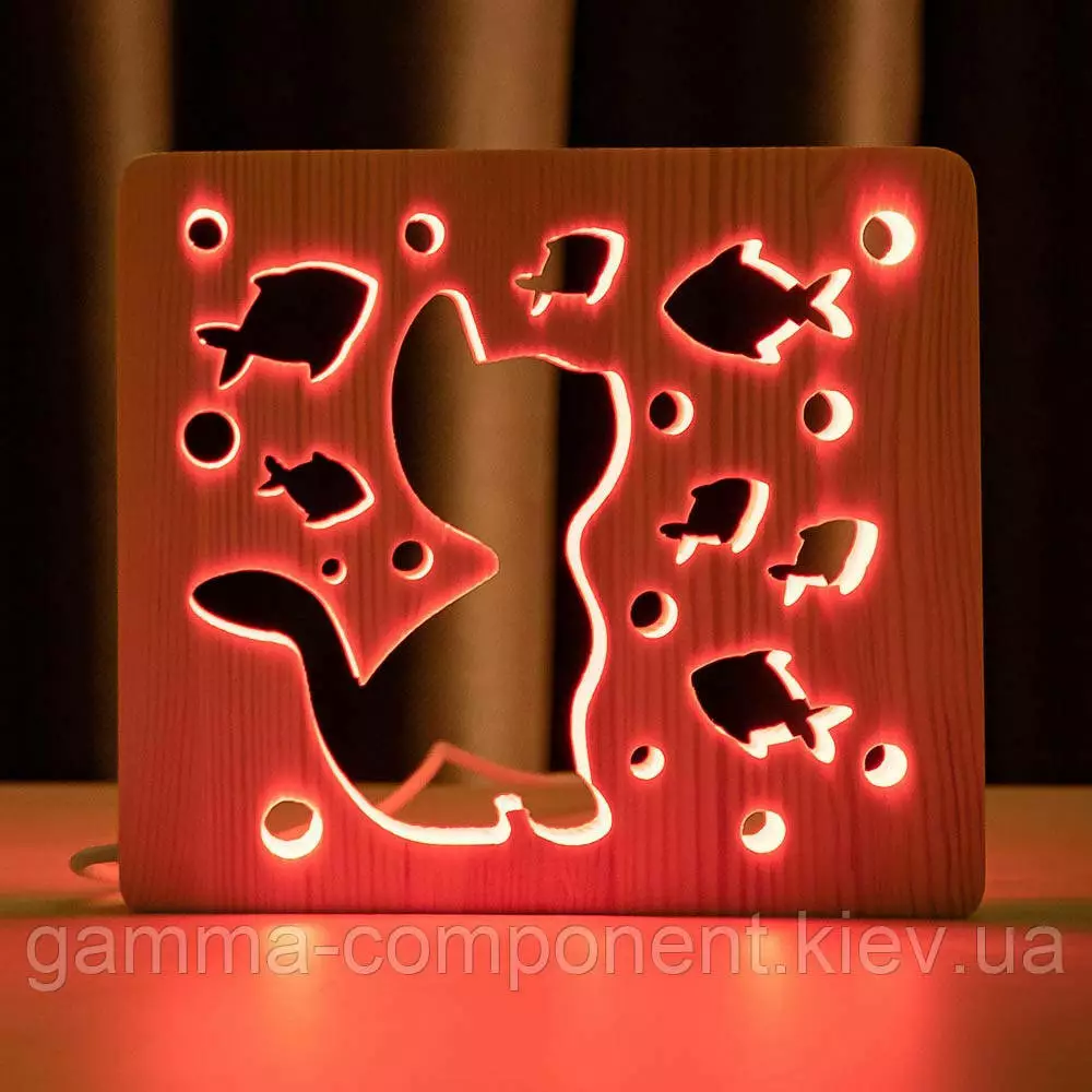 Світильник нічник з дерева LED "Кіт і рибки" з пультом і регулюванням кольори, RGB