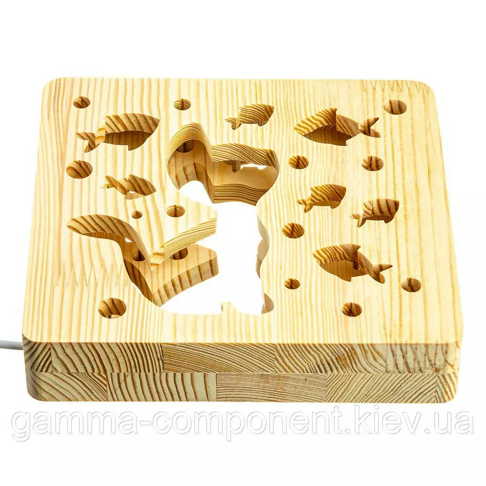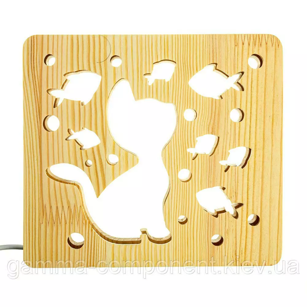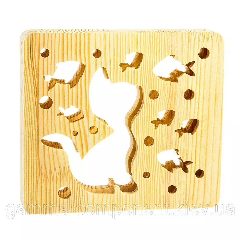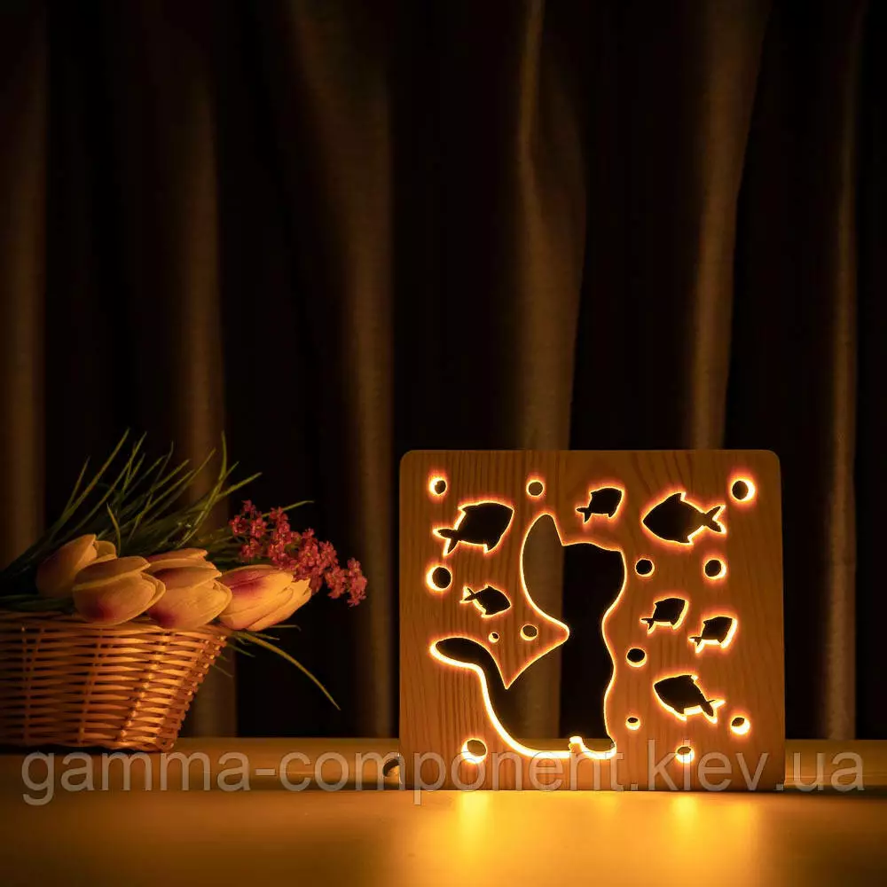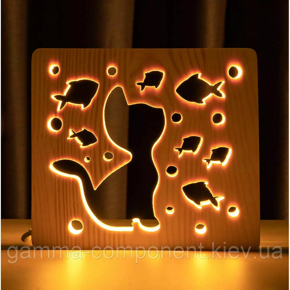 Світильник нічник з дерева LED "Кіт і рибки" з пультом і регулюванням світла, колір теплий білий