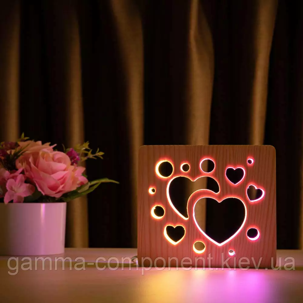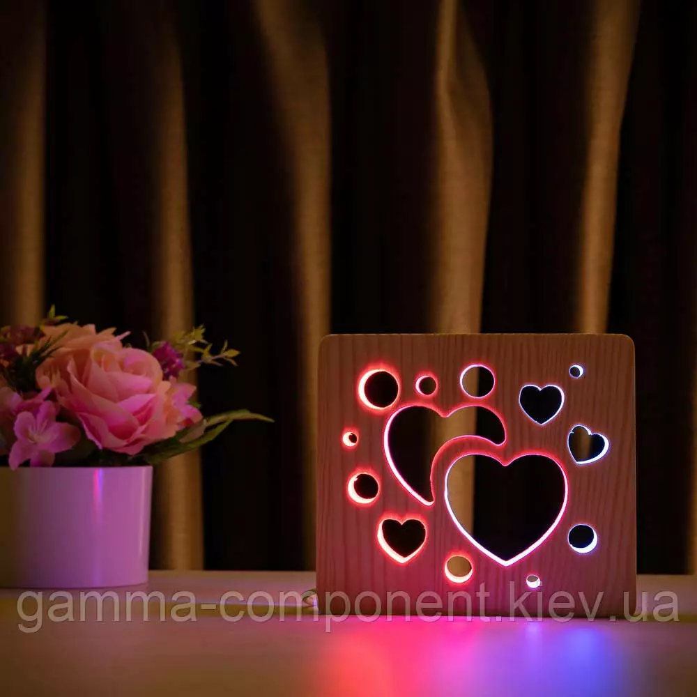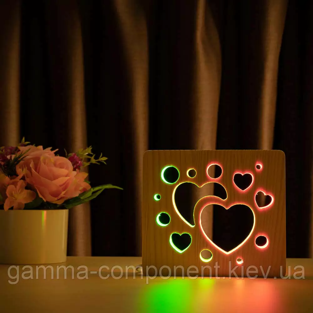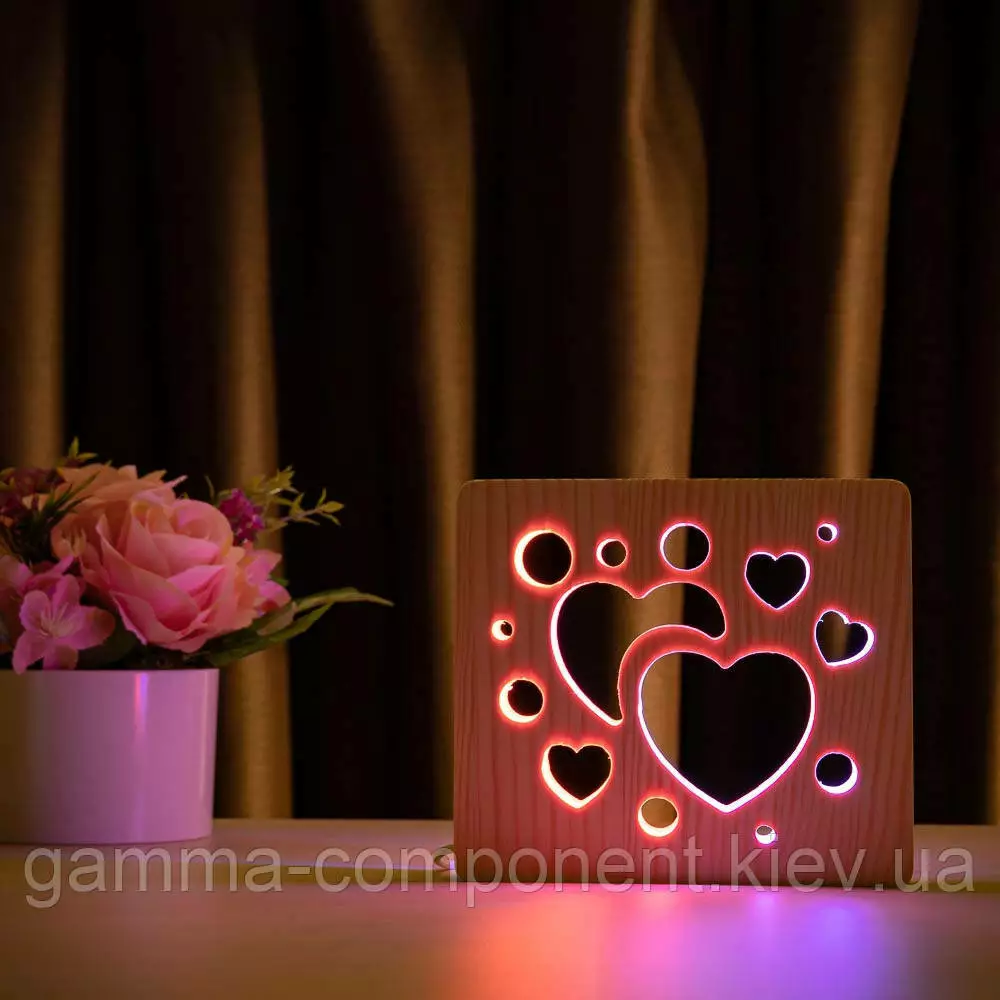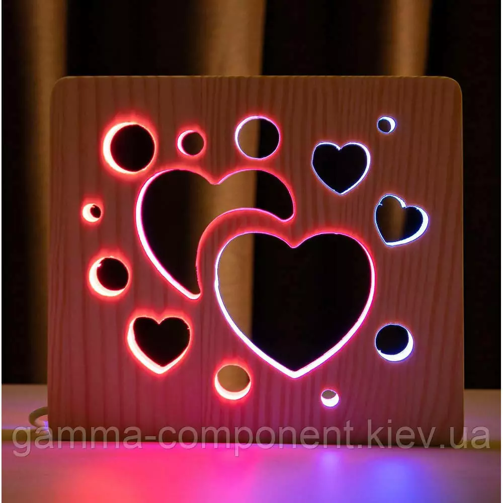 Світильник нічник з дерева LED "Серденька" з пультом і регулюванням кольору, подвійний RGB