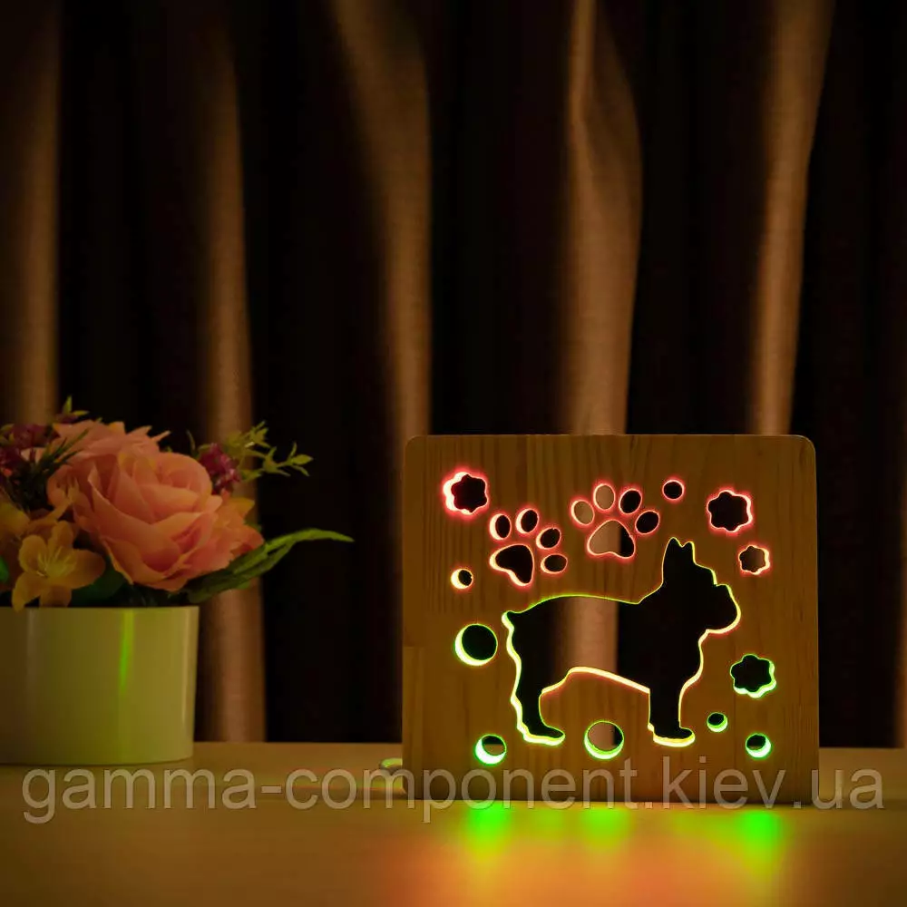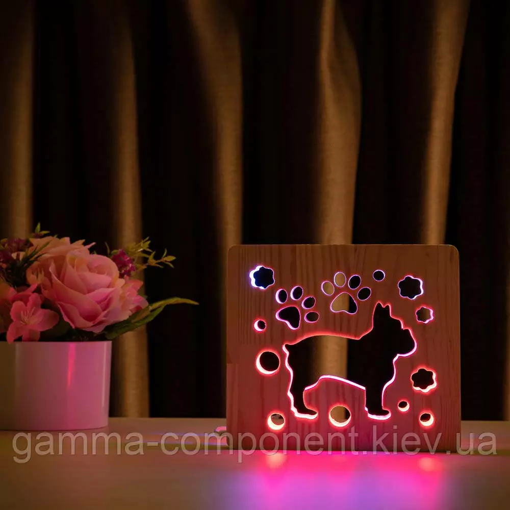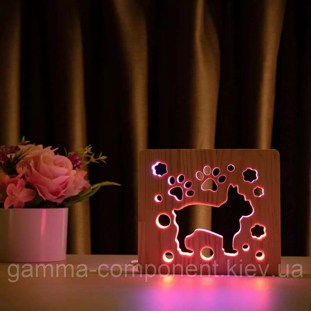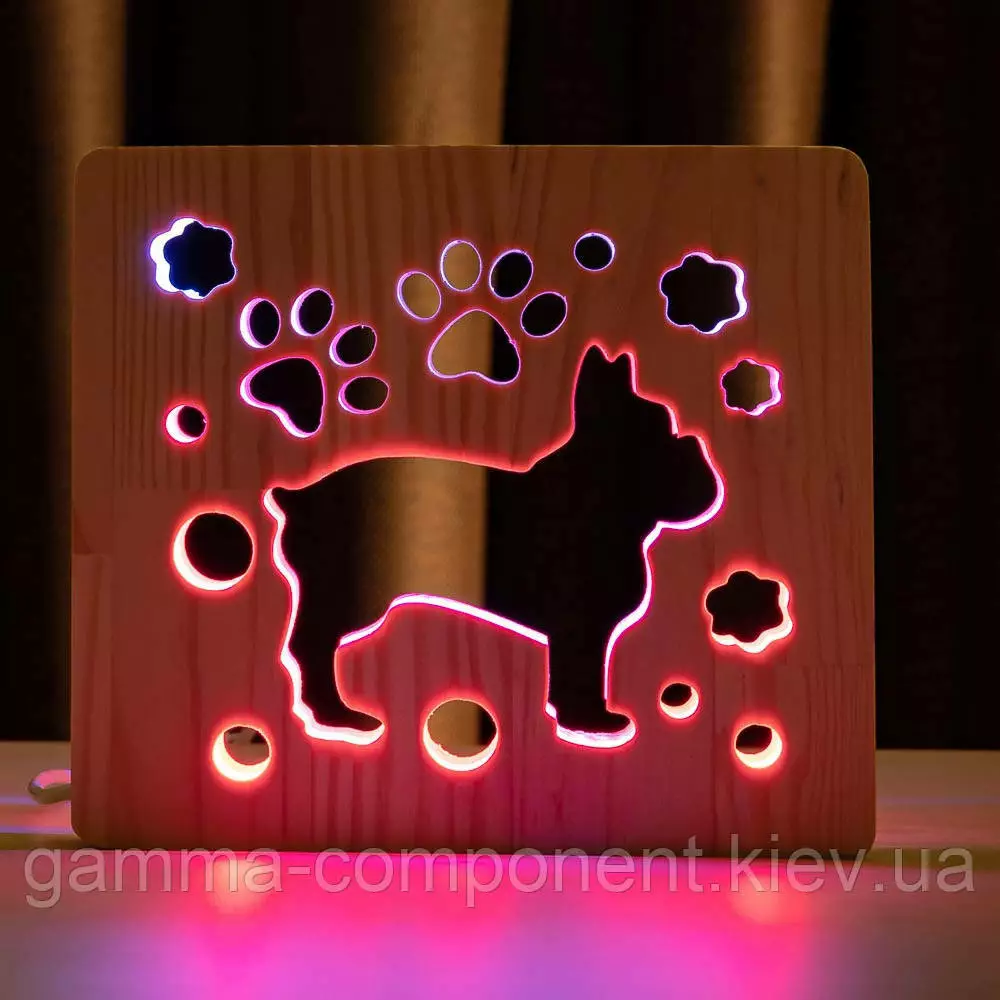 Світильник нічник з дерева LED "Собака бульдожка" з пультом і регулюванням кольору, подвійний RGB