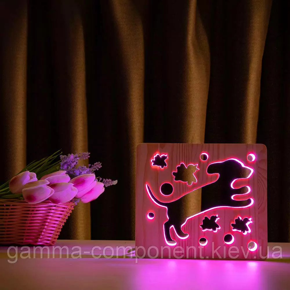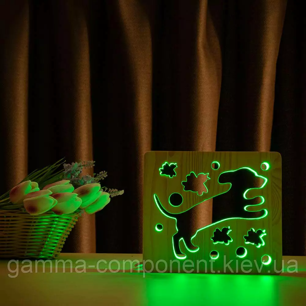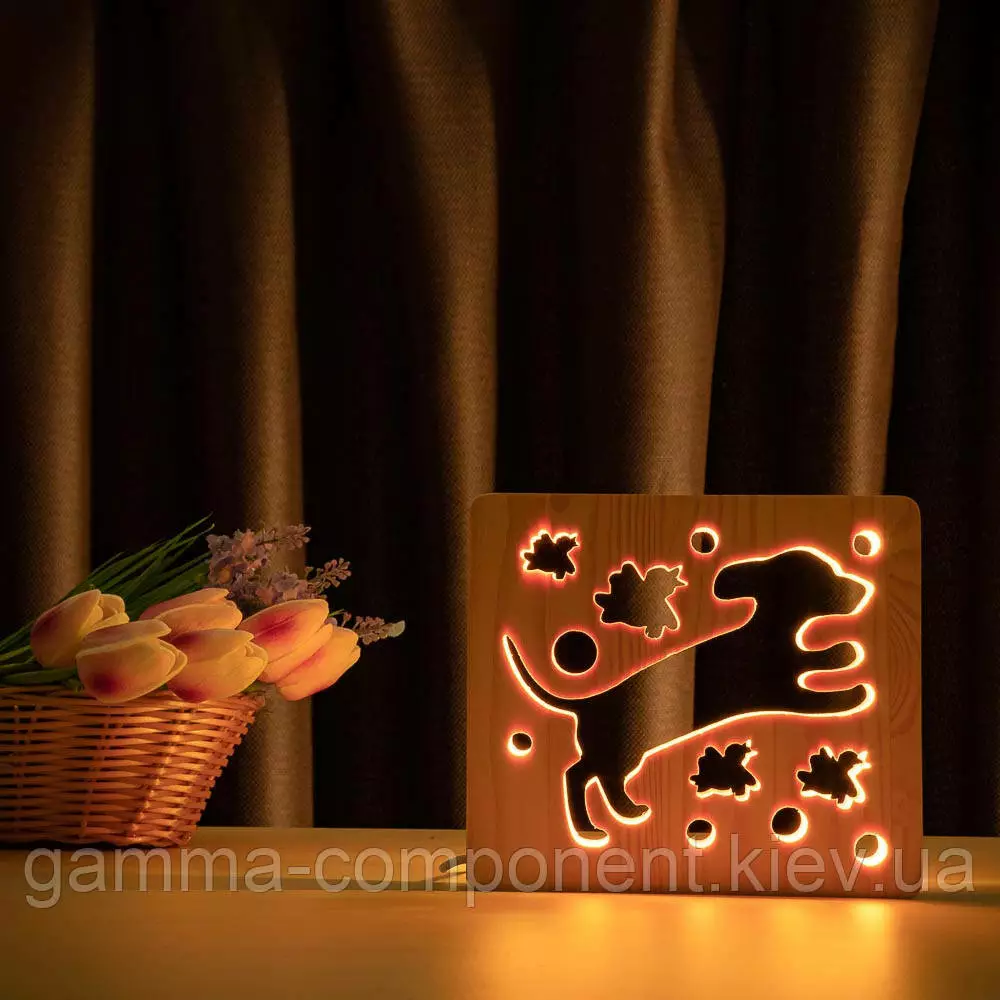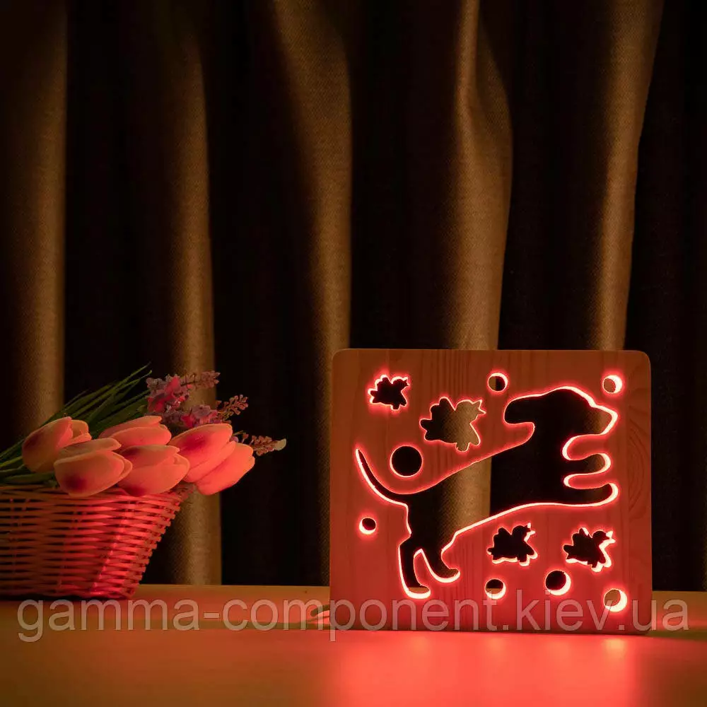 Світильник нічник з дерева LED "Собака і пташки" з пультом і регулюванням кольори, RGB