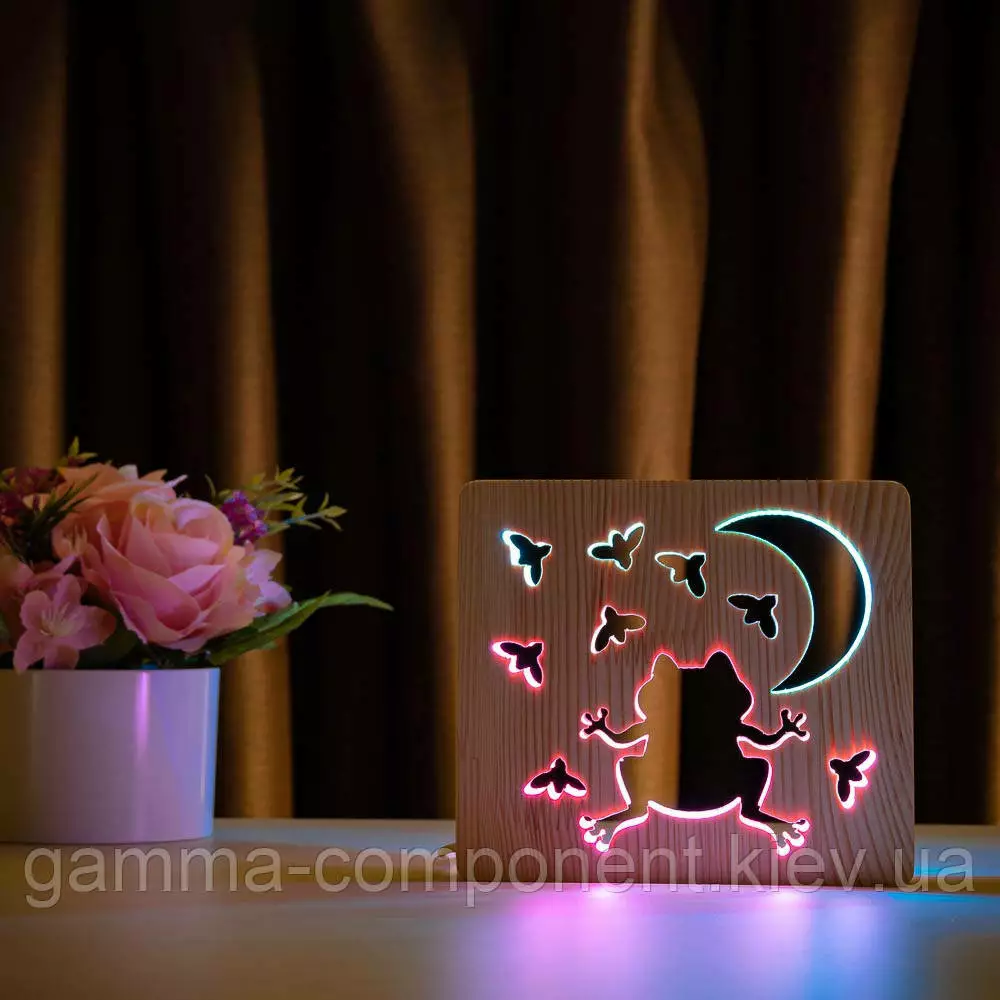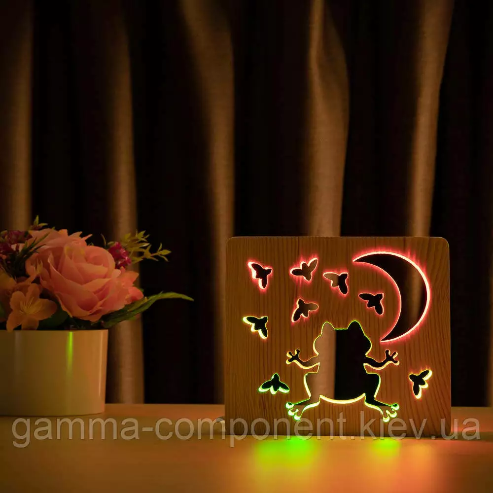 Світильник нічник з дерева LED "Жаба і цвіркуни" з пультом і регулюванням кольору, подвійний RGB