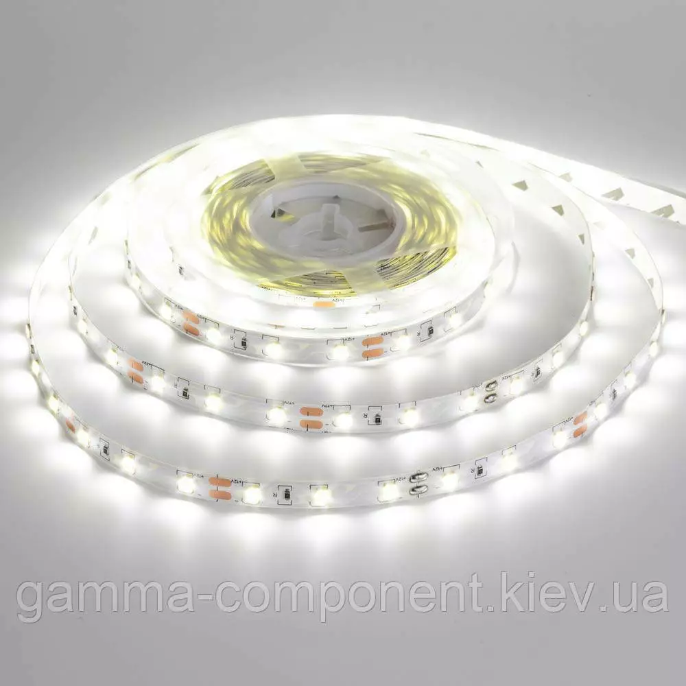 Світлодіодна стрічка 12 вольт холодна біла - це гнучка друкована плата, поміщена в герметичну силіконову оболонку, на якій змонтовані світлодіоди і струмообмежуючі резистори, із зворотного боку нанесена клейка стрічка.
