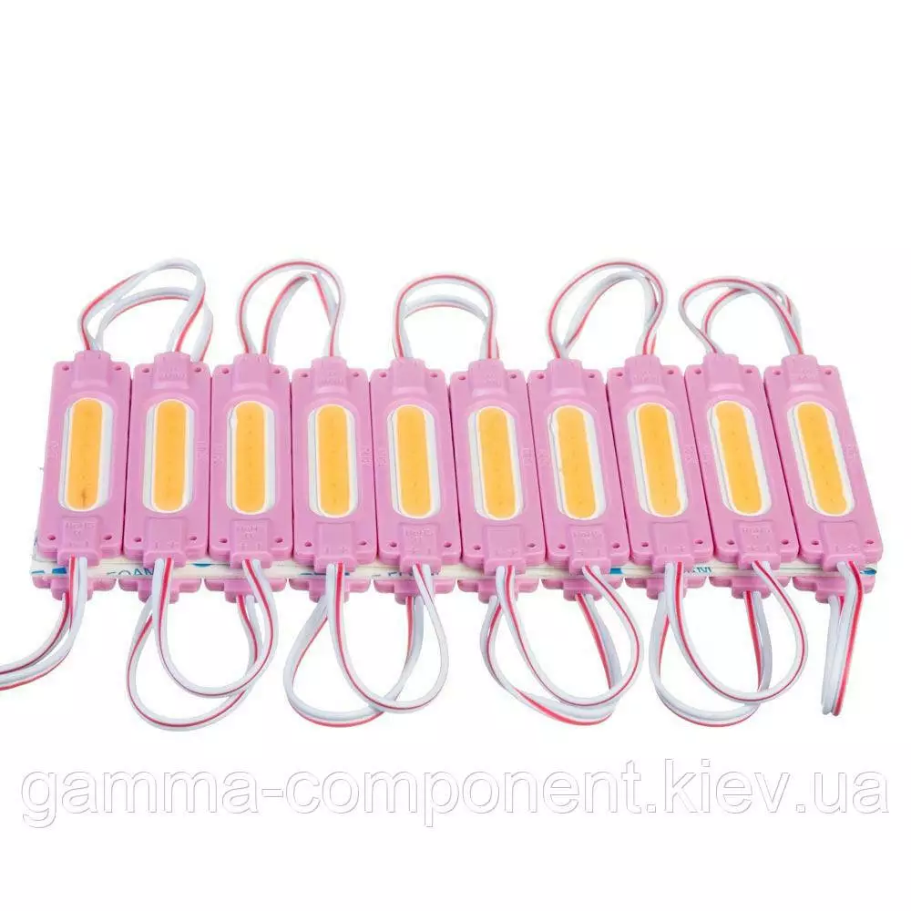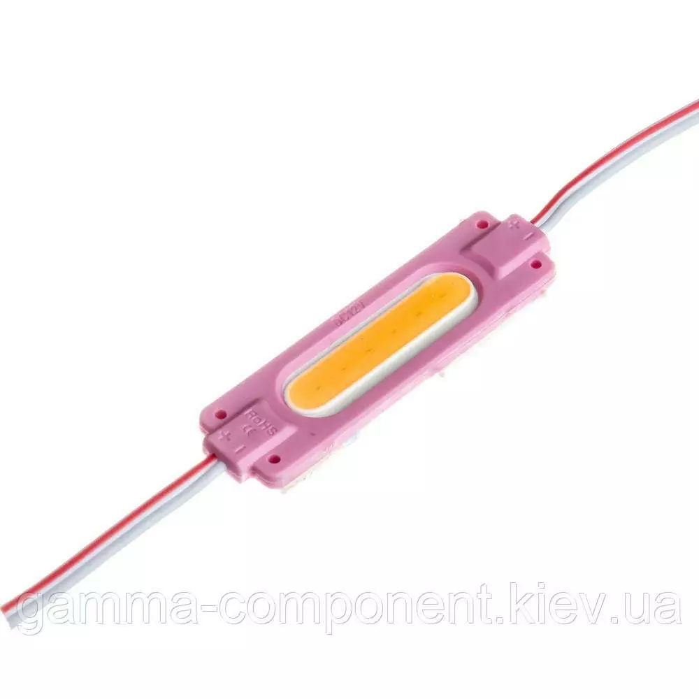 Led модуль со светодиодом COB овальной формы. Цвет свечения – розовый (Pink). Также присутствуют и другие цвета в ассортименте: холодный белый, синий, красный, зеленый. Потребляемая мощность модуля составляет не более 2 Вт. Напряжение питания 12 вольт. Класс защиты модуля - IP65, соединение двухпроводное. Срок службы – 30 000 часов.
