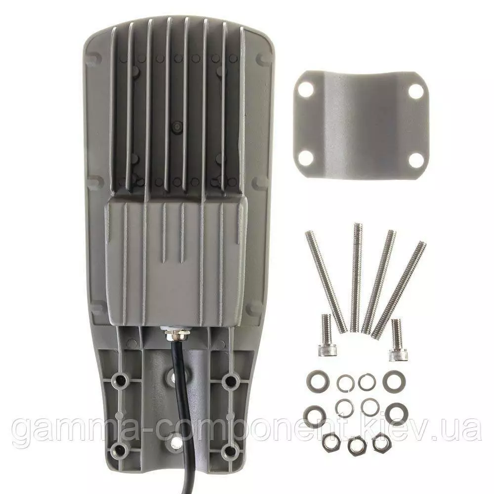 У комплектацію до прожектору входять: знімне кріплення – 1 шт., болти без капелюшка – 4 шт., гайки – 4 шт., шурупи – 2 шт., шайби – 8 шт.